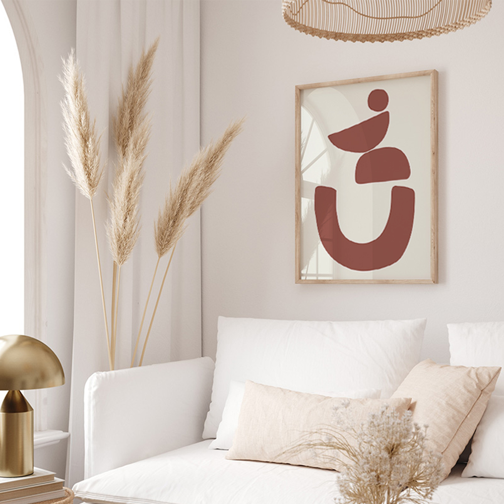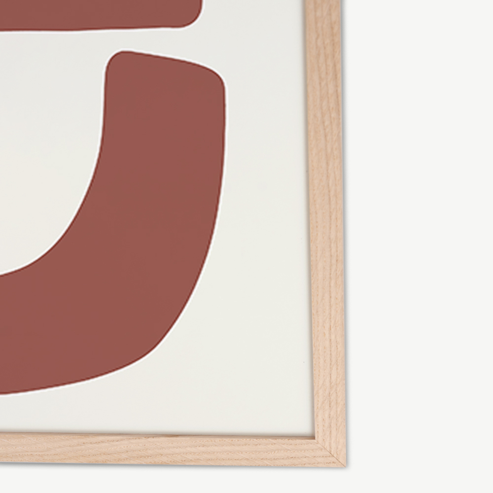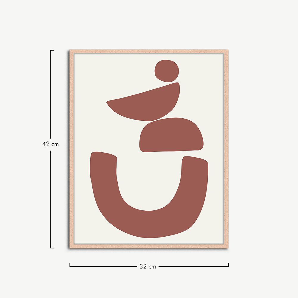 Das abstrakte Wandbild Formen wird in einem naturfarbenen Rahmen geliefert, der für seine Langlebigkeit und natürliche Schönheit bekannt ist. Der Holzrahmen präsentiert das abstrakte Wandbild auf eine Weise, die ihm Tiefe und Dimension verleiht, wodurch es zu einem echten Blickfang in Ihrem Interieur wird.