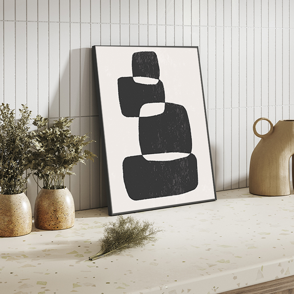 Diese Wanddeko ist perfekt, um Ihrem Wohn-, Schlaf- oder Arbeitszimmer eine elegante und moderne Atmosphäre zu verleihen. Der minimalistische schwarze Rahmen sorgt dafür, dass die abstrakte Kunst im Mittelpunkt steht, während der Holzrahmen zusätzliche Raffinesse und Wärme hinzufügt.