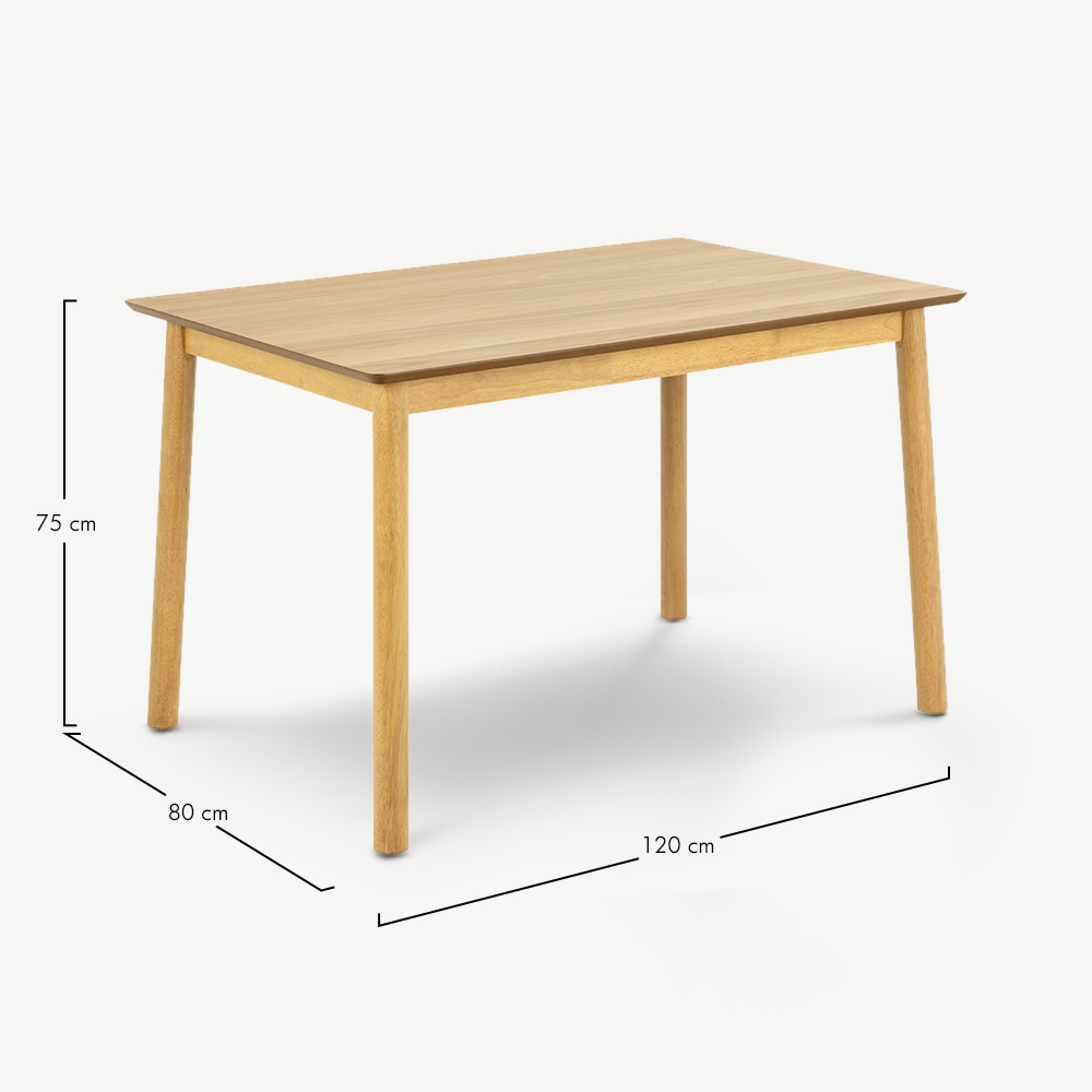 Mit 120 cm Länge bietet der Aston Tisch bequem Platz für bis zu 4 Personen – ideal für Küchen, kleine Essbereiche oder kompakte Räume. Die runden Holzbeine sorgen für Stabilität und eine luftige Optik, während die glatte, lackierte Oberfläche besonders pflegeleicht ist – perfekt für den Alltag und gesellige Runden.