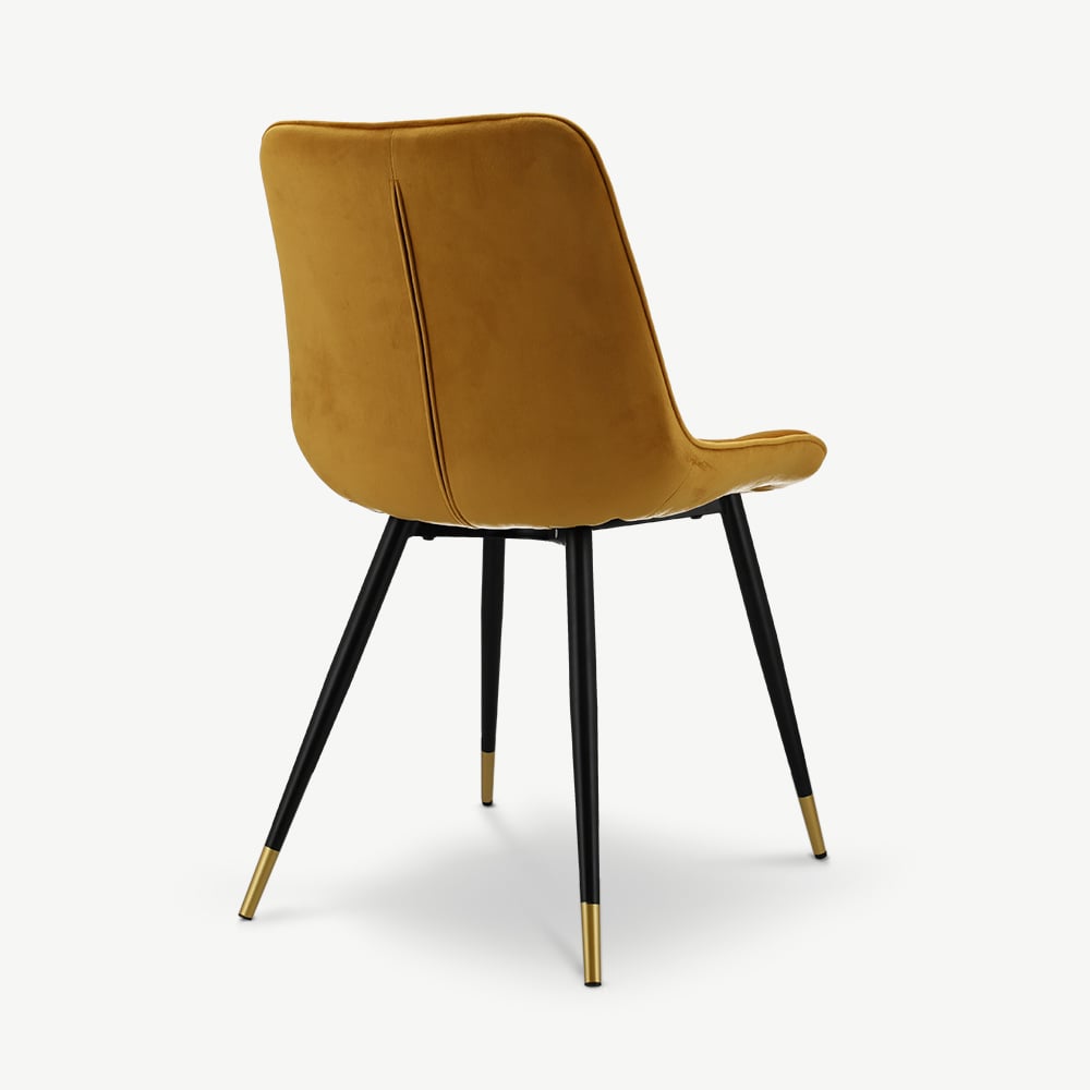 Der gelbe Samtbezug strahlt Wärme und Persönlichkeit aus. Ideal für moderne, Retro- oder Mid-Century-Interieurs passt er hervorragend zu Holztischen oder gemischten Materialien. Die goldfarbenen Fußspitzen verleihen dem Look einen Hauch von Glamour.