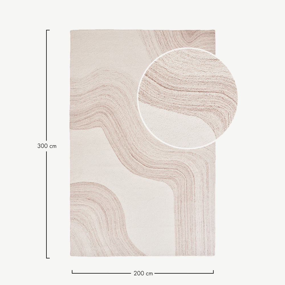 Der Corin Teppich wird aus 100% handgetufteter Wolle gefertigt und bietet eine weiche Textur sowie langlebige Qualität. Die sanfte elfenbeinfarbene Basis mit hellbraunen Wellen passt perfekt zu neutralen Innenräumen und harmoniert wunderbar mit Holzmöbeln, minimalistischen Räumen oder skandinavisch inspirierten Dekoren. Seine natürlichen Fasern verleihen Ihrem Zuhause Wärme und Tiefe.