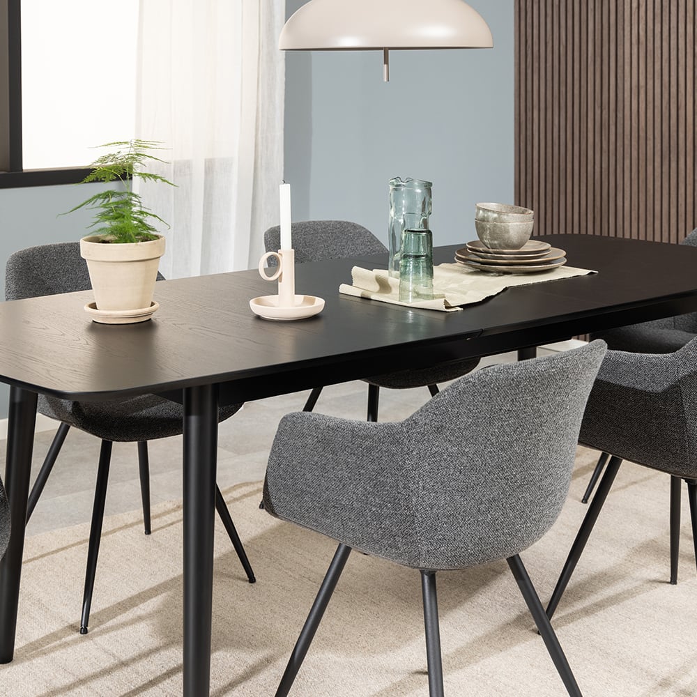 Mit seinen klaren Linien und dem tiefschwarzen Finish setzt der Devi ausziehbare Esstisch ein dramatisches, aber zeitloses Statement in jedem Esszimmer. Ob in einem modernen Loft, einer offenen Wohnküche oder einem eleganten Essbereich – seine ausziehbare Funktion und die markante Farbe machen ihn zu einem auffälligen, aber praktischen Mittelpunkt, der sich nahtlos in verschiedene moderne Einrichtungsstile einfügt.