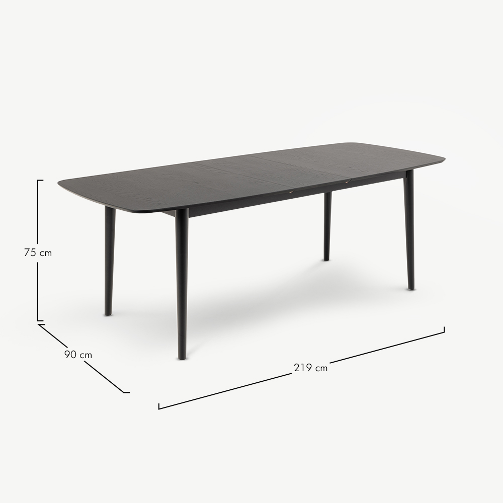 Der Devi ausziehbare rechteckige Esstisch verleiht jedem Essbereich eine moderne, elegante Note. Mit einer markanten Tischplatte in schwarzem Furnier und massiven Holzbeinen gefertigt, bietet dieses stilvolle Möbelstück bequem Platz für bis zu acht Personen. Dank einer diskreten Butterfly-Erweiterung kann der Tisch von 180 cm auf 219 cm verlängert werden, was ihn perfekt für den täglichen Gebrauch und größere Zusammenkünfte macht.