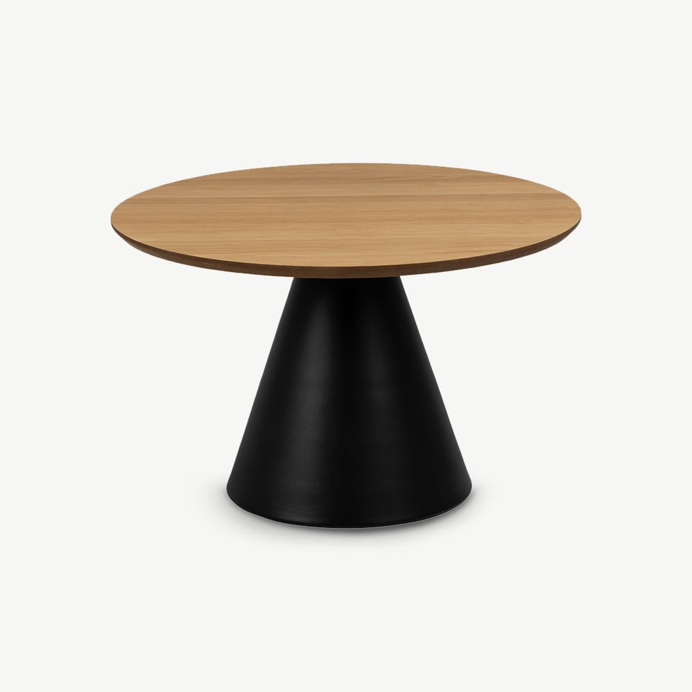 Der Ella Couchtisch Ø65 cm vereint Funktionalität und Form in perfektem Gleichgewicht. Die FSC-zertifizierte Tischplatte aus Eichenfurnier ruht auf einem markanten, konischen Metallfuß in mattem Schwarz – ein zeitloses Design mit praktischer Alltagstauglichkeit. Mit einer Höhe von 43 cm eignet sich der Tisch ideal vor dem Sofa oder in Kombination mit anderen Ella Tischen für ein abgestuftes, designorientiertes Arrangement.
