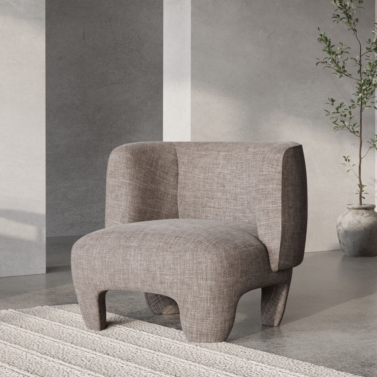 Der Elna Accent Chair ist mit weichem grauen Stoff bezogen, der Wärme und Eleganz ausstrahlt. Die reichhaltige Textur und der erdige Farbton machen ihn zu einem vielseitigen Möbelstück, das mühelos moderne, skandinavische oder minimalistische Interieurs ergänzt. Kombinieren Sie ihn mit einem Holzcouchtisch, einem Beistelltisch, neutralen Teppichen oder metallischen Akzenten, um ein harmonisches und stilvolles Ambiente zu schaffen.