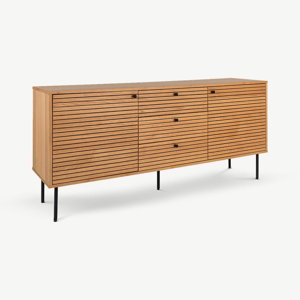 Hergestellt aus natürlichem Eichenfurnier, betont das Nara Sideboard die Schönheit der Holzmaserung und verleiht Ihrem Raum Wärme und organischen Charme. Die Lamellendetails sorgen für Textur und Raffinesse, während die schwarzen Metallbeine eine moderne und langlebige Basis bieten. Dieses Sideboard passt mühelos zu skandinavischen, minimalistischen oder zeitgenössischen Interieurs und harmoniert perfekt mit neutralen Tönen, strukturierten Dekorationen oder metallischen Akzenten.