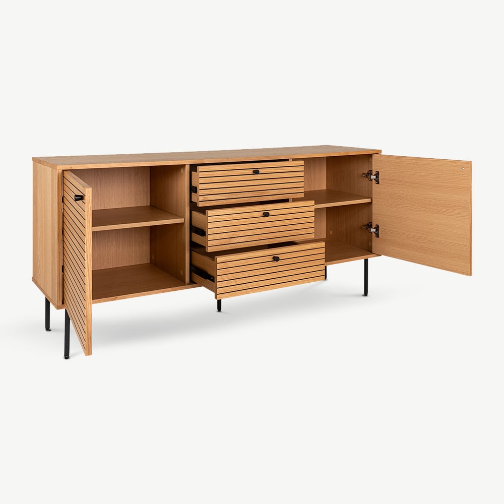 Das Nara Holz-Sideboard kombiniert Funktionalität mit zeitlosem Design und bietet eine stilvolle Aufbewahrungslösung für moderne Haushalte. Gefertigt aus natürlichem Eichenfurnier, verfügt dieses Sideboard über ein elegantes Lamellendesign, zwei geräumige Türen, drei Schubladen und robuste schwarze Metallbeine. Sein vielseitiges Aussehen macht es zur perfekten Ergänzung für Esszimmer, Wohnräume oder Flure.