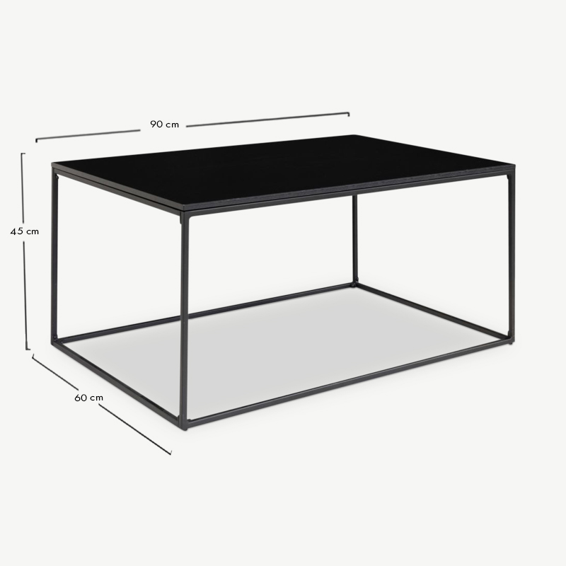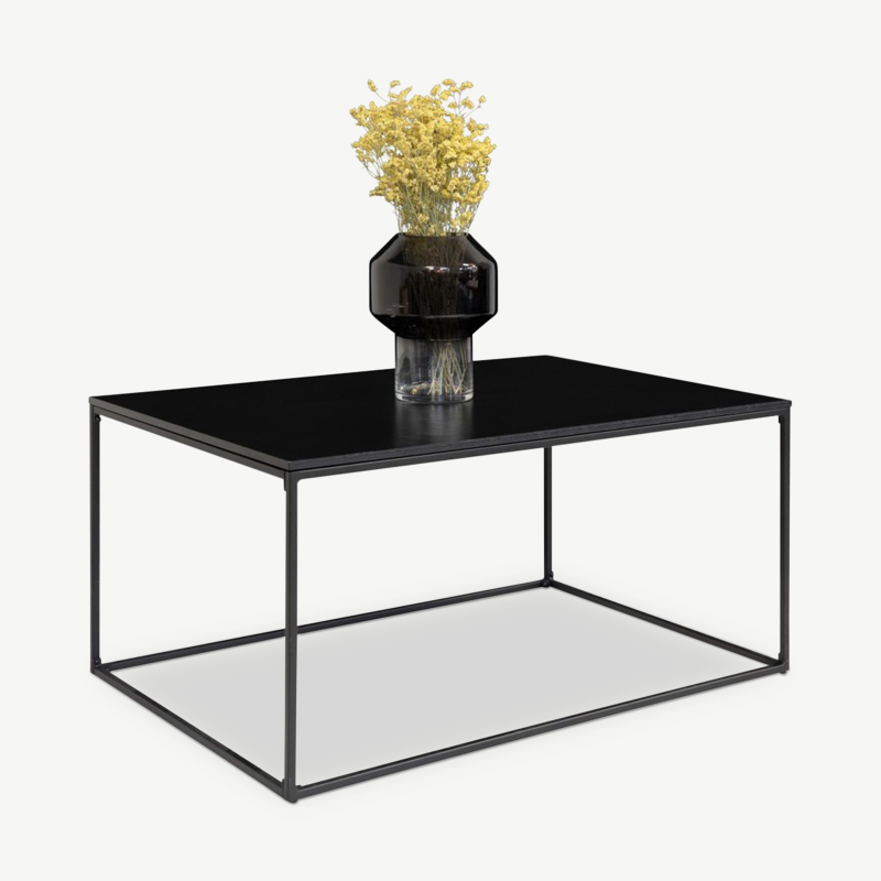 Der Vice Rechteckige Couchtisch kombiniert eine schwarze Holzplatte mit einem stabilen Metallrahmen und verkörpert ein klares, minimalistisches Design. Sein industrieller Stil macht ihn zu einem vielseitigen Mittelpunkt für moderne und rustikale Wohnräume.
