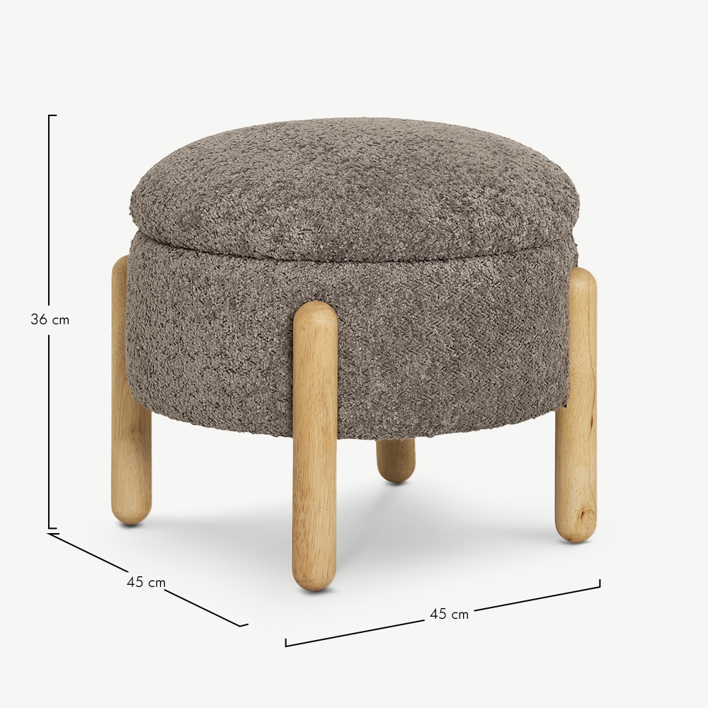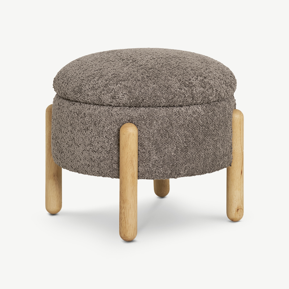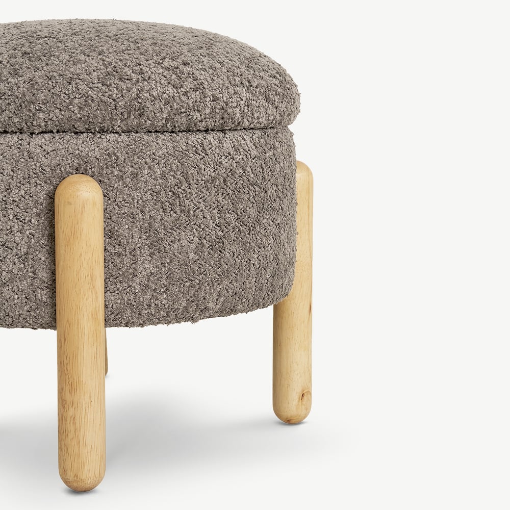 Midas Aufbewahrungs-Pouffe in Taupefarbenes Bouclé mit Natürlichen Holzbeinen