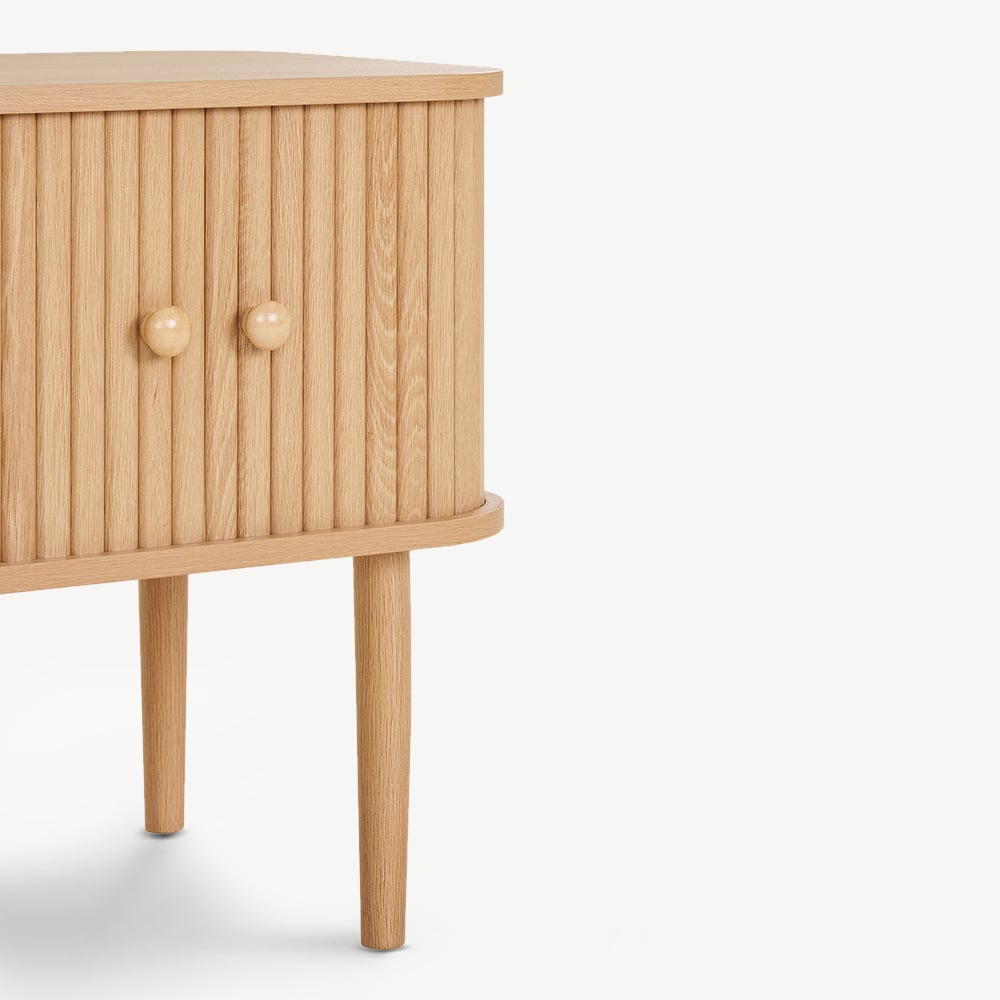 Aus hochwertigem, naturbelassenem Kiefernholz gefertigt, zeigt der Mila Konsolentisch organische Texturen und eine weiche, helle Oberfläche, die sich mühelos mit verschiedenen Einrichtungsstilen kombinieren lässt. Die klaren Linien und dezent gerippten Details an den Türen verleihen ihm einen modernen Touch, wodurch er ideal zu skandinavischen, Japandi- oder minimalistischen Räumen passt. Kombinieren Sie ihn mit hölzernen Bettgestellen, weichen Textilien oder neutraler Dekoration für ein harmonisches und einladendes Gesamtbild.
