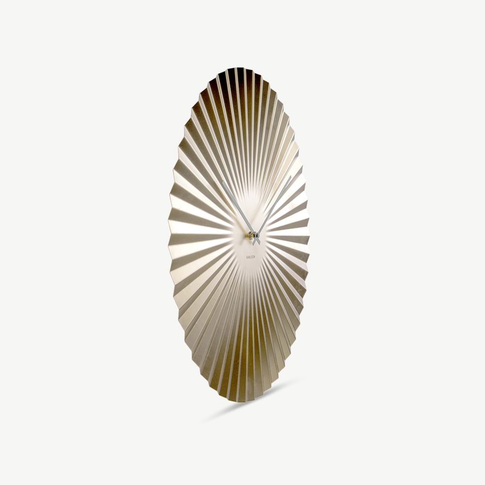 Wir präsentieren die große Moon Wanduhr aus goldfarbenem Stahl - eine einzigartige und elegante Kreation aus dem Hause Furnicher, die Funktionalität mit künstlerischem Design verbindet. Diese Wanduhr, deren Form an einen japanischen Fächer erinnert, besticht durch ihre einzigartige Ästhetik, die sich perfekt in moderne Interieurs einfügt.