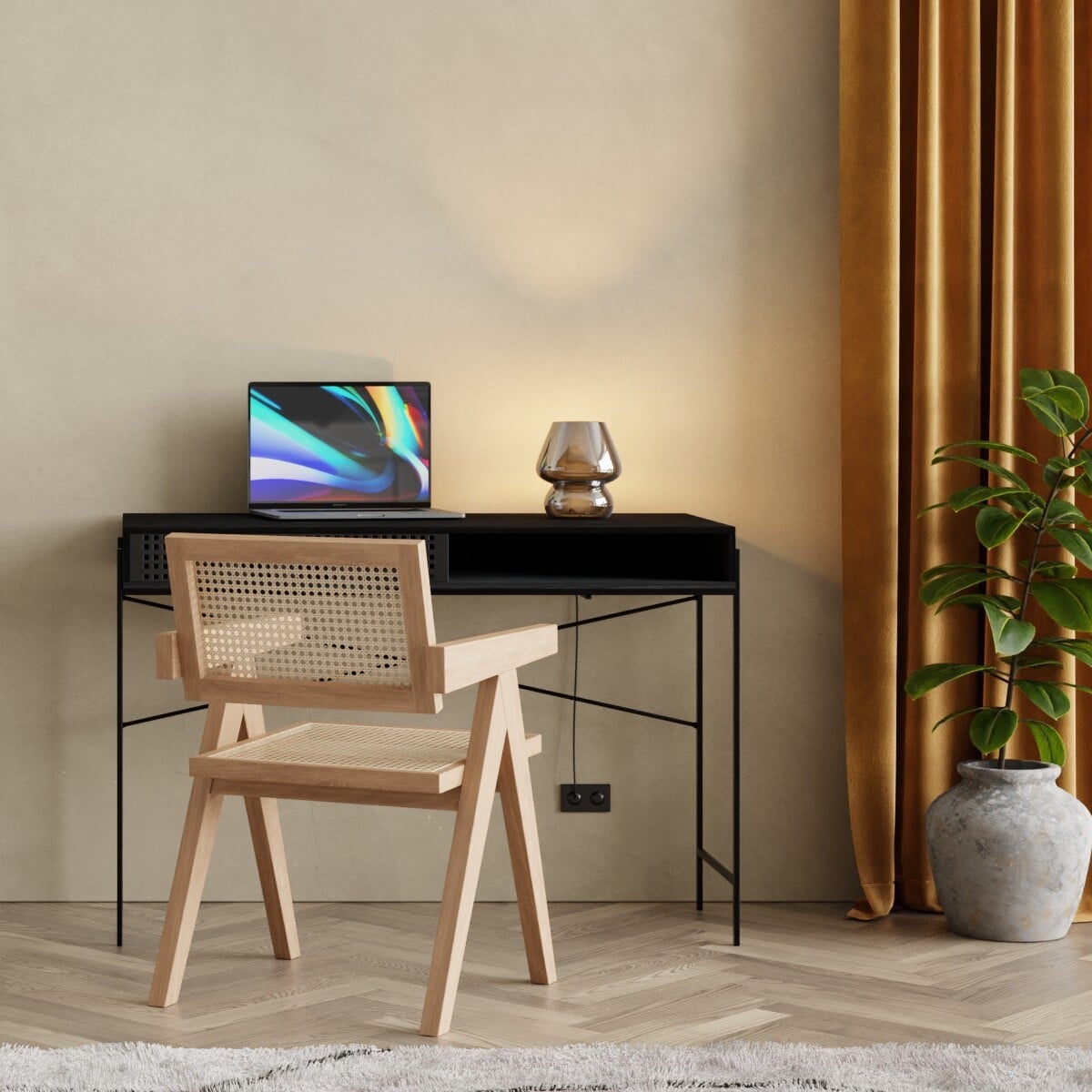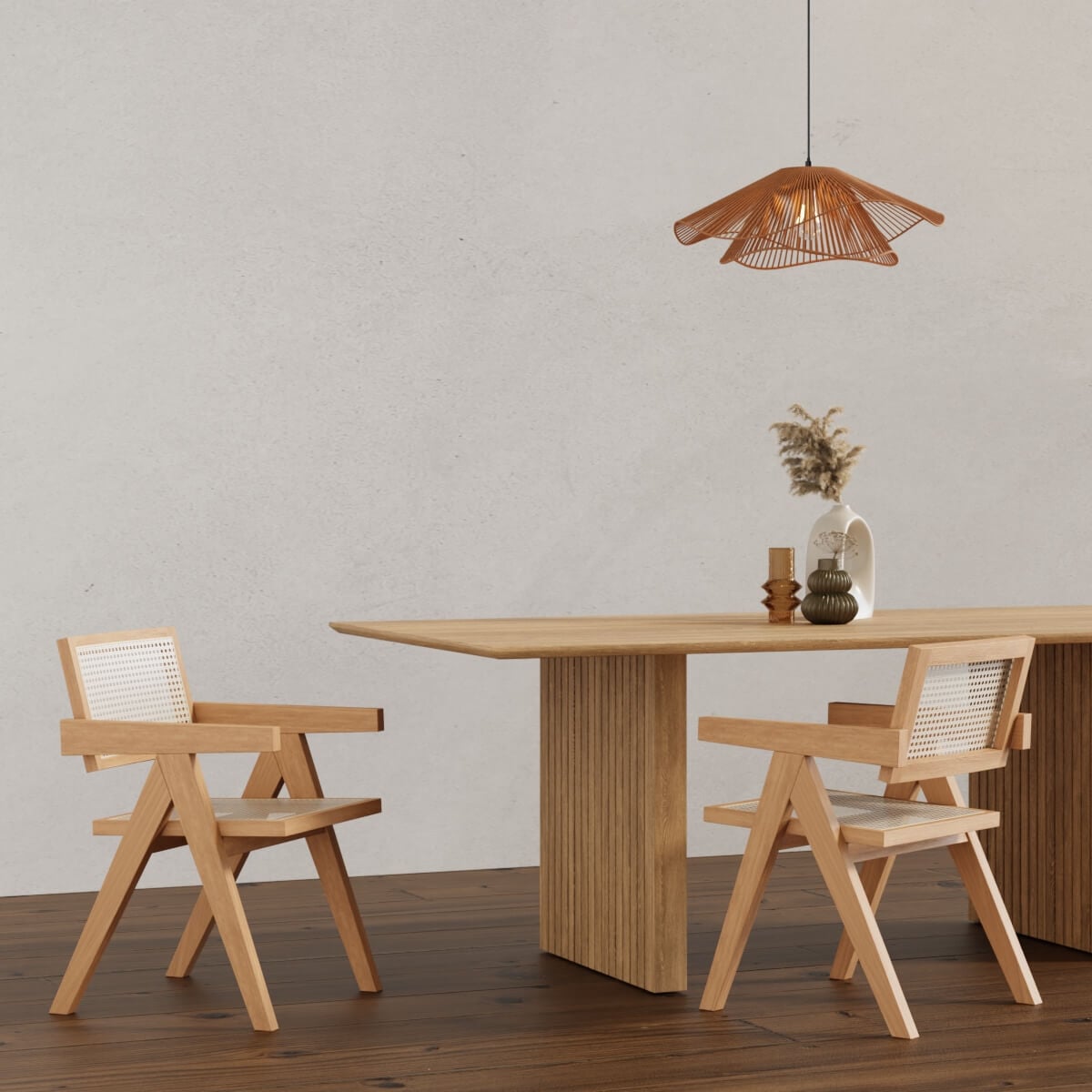 Durch seine architektonische Form und die Verwendung natürlicher Materialien strahlt der Peter Stuhl eine warme, entspannte Atmosphäre aus. Er fügt sich mühelos in helle, minimalistische oder boho-inspirierte Räume ein und verleiht einen handwerklichen Akzent mit modernem Touch.