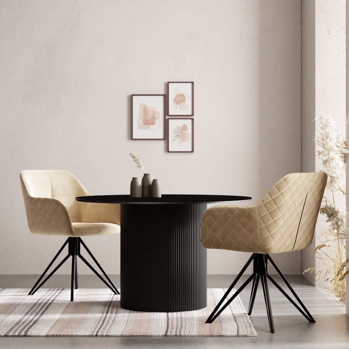 Die 120 cm große Tischplatte bietet ausreichend Platz für Abendessen, Gesellschaftsspiele oder gesellige Abende mit Freunden. Die runde Form schafft eine gemütliche, intime Atmosphäre, die zum entspannten Austausch bei den Mahlzeiten einlädt.