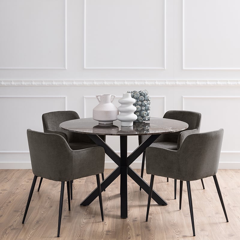 Setzen Sie ein starkes Statement in Ihrem Essbereich mit dem runden Talon Esstisch. Mit einer luxuriösen Tischplatte aus braunem Marmor und schwarz, grob pulverbeschichteten Metallbeinen bietet dieser Tisch mit Ø120 cm bequem Platz für bis zu 6 Personen. Er vereint modernes Design mit zeitlosen Materialien – ideal für stilvolle Abendessen und besondere Anlässe.