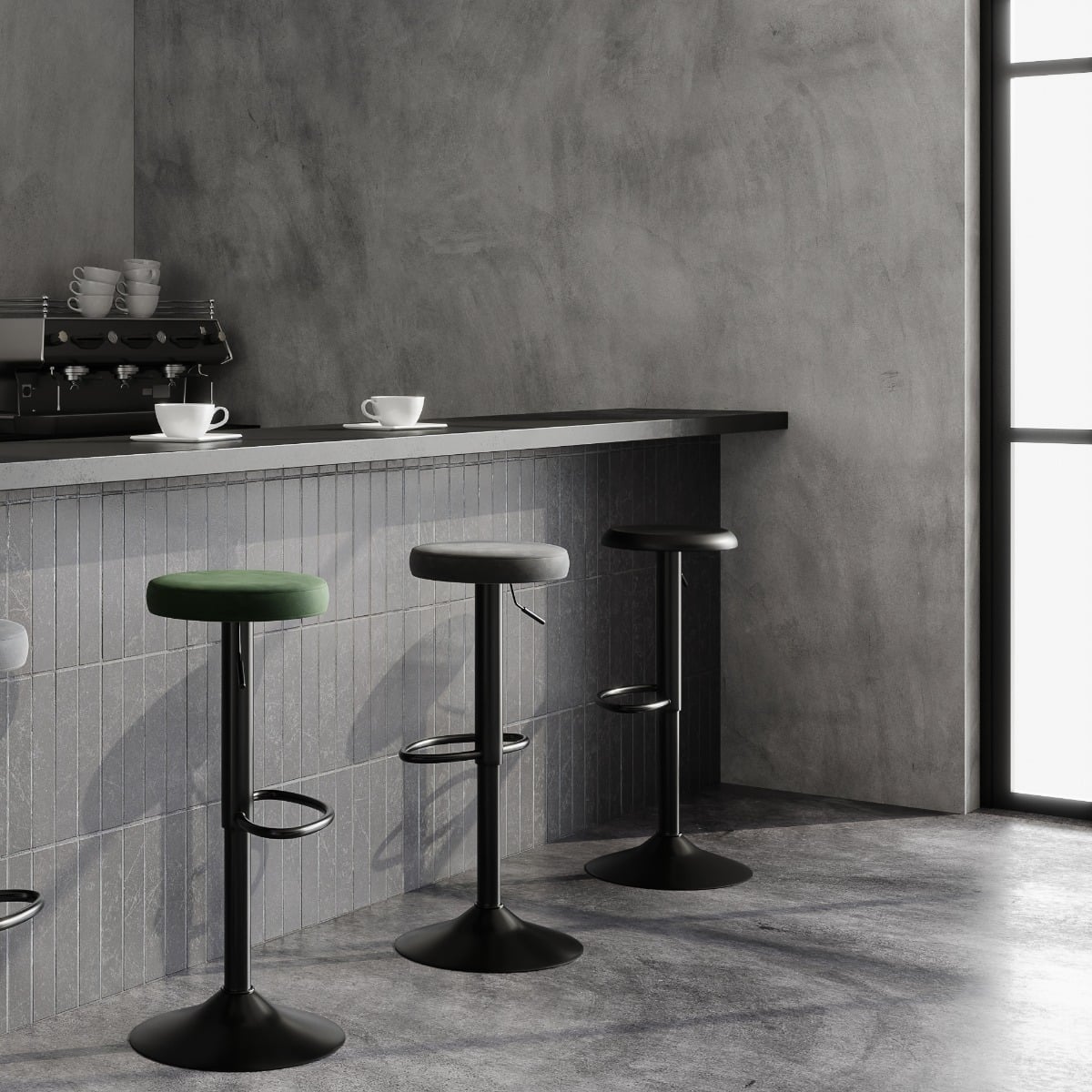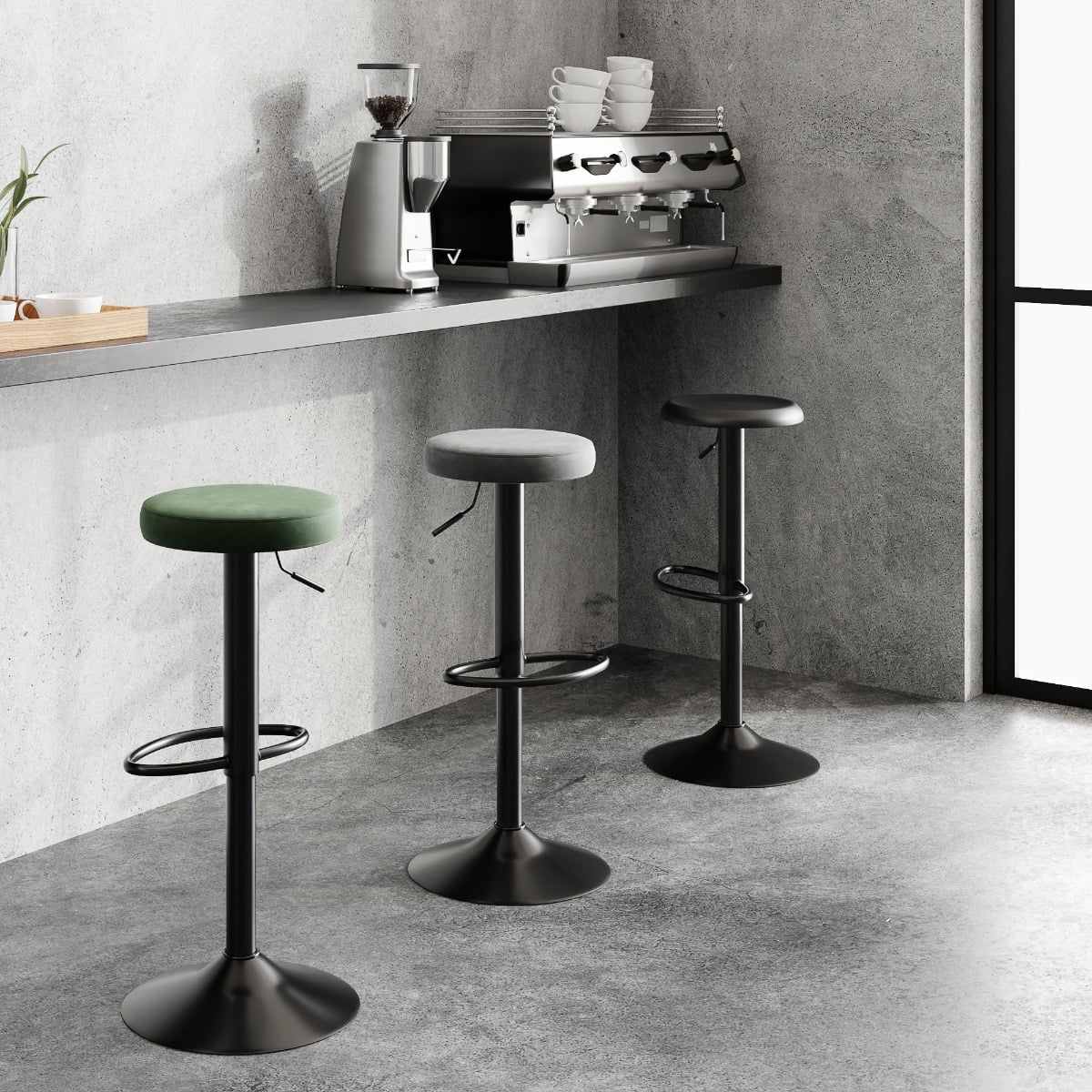 Mit seiner eleganten Stoffpolsterung und dem robusten Trompetenfuß mit mattschwarzer Pulverbeschichtung kombiniert der Seja Barhocker Komfort mit stilvollem Design. Die Fußstütze unterstützt eine bequeme Sitzhaltung, während die Höhenverstellfunktion es ermöglicht, den Hocker mühelos auf die optimale Höhe einzustellen, passend zu Ihrer Theke oder Ihrem Arbeitsplatz.