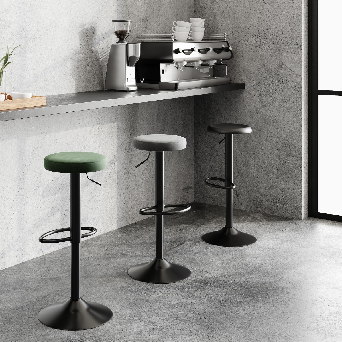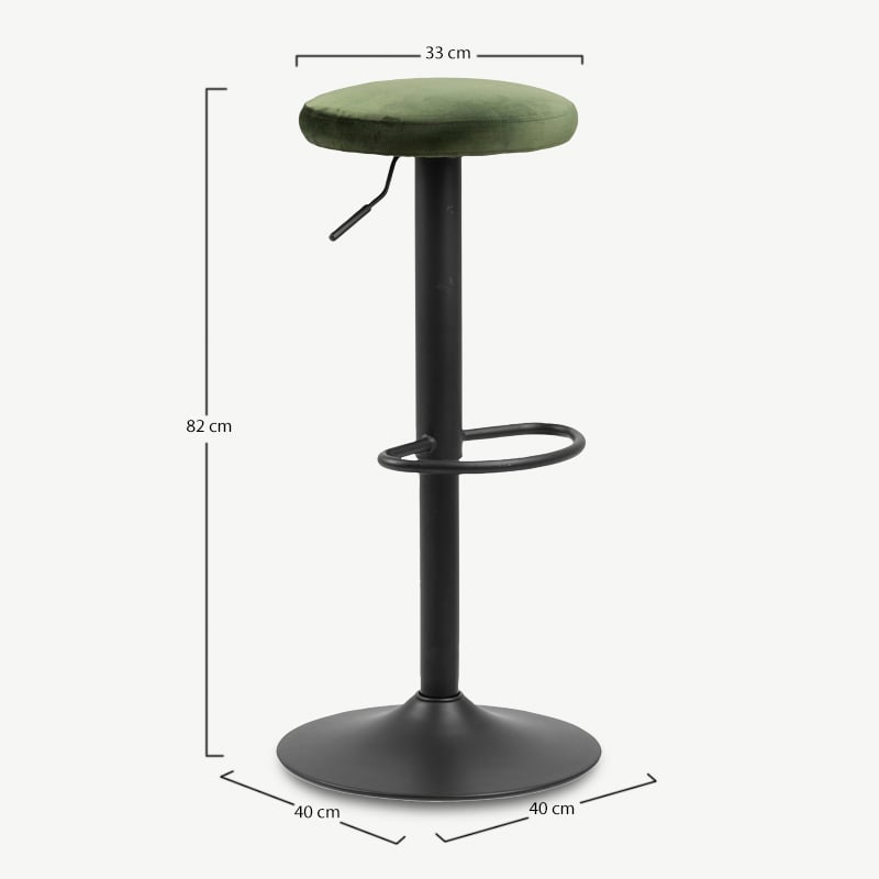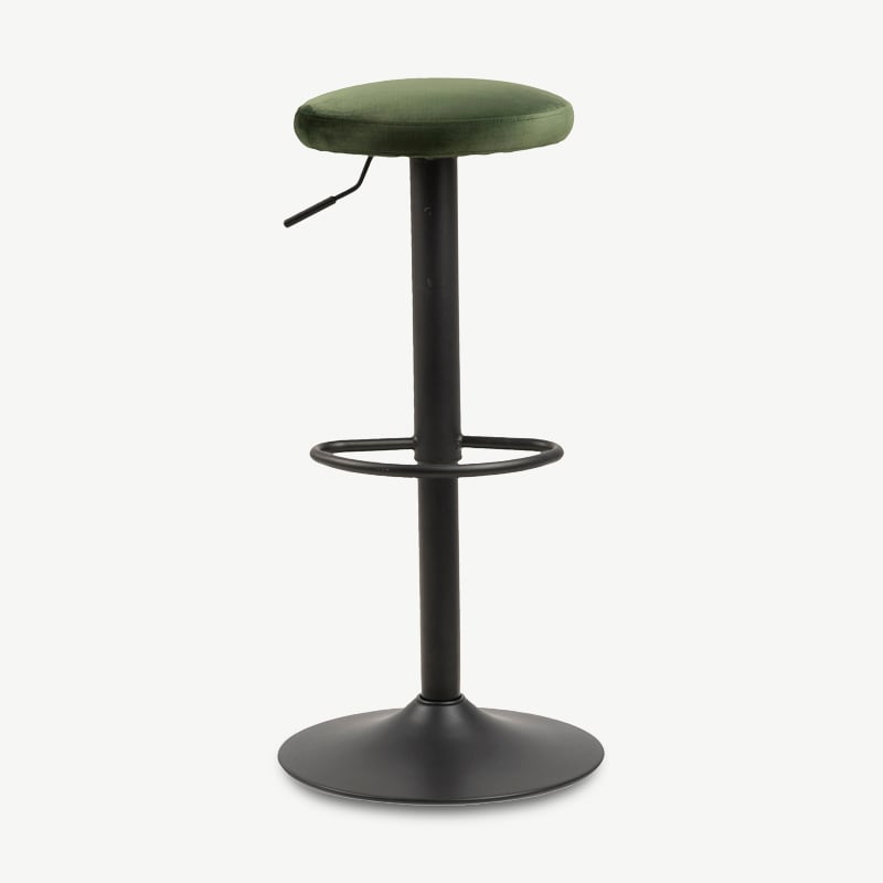Mit seinem luxuriösen grünen Samtbezug und dem robusten Trompetenfuß in mattschwarzer Pulverbeschichtung bringt der Seja Barhocker Farbe und Stil in Ihr Zuhause. Die höhenverstellbare Funktion ermöglicht eine nahtlose Anpassung an verschiedene Thekenhöhen, während die integrierte Fußstütze ausgezeichneten Komfort und Unterstützung bietet.