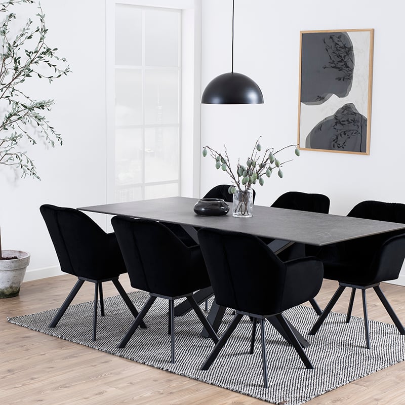 Die Talon Esstische vereinen modernes Design mit außergewöhnlicher Widerstandsfähigkeit. Mit einer markanten schwarzen Keramikplatte und einem skulpturalen Kreuzgestell aus schwarzem Metall bieten die Varianten in 160 und 200 cm Länge bequem Platz für 6 bzw. 8 Personen. Das perfekte Herzstück für zeitgemäße Essbereiche, in denen Funktion und Stil Hand in Hand gehen.