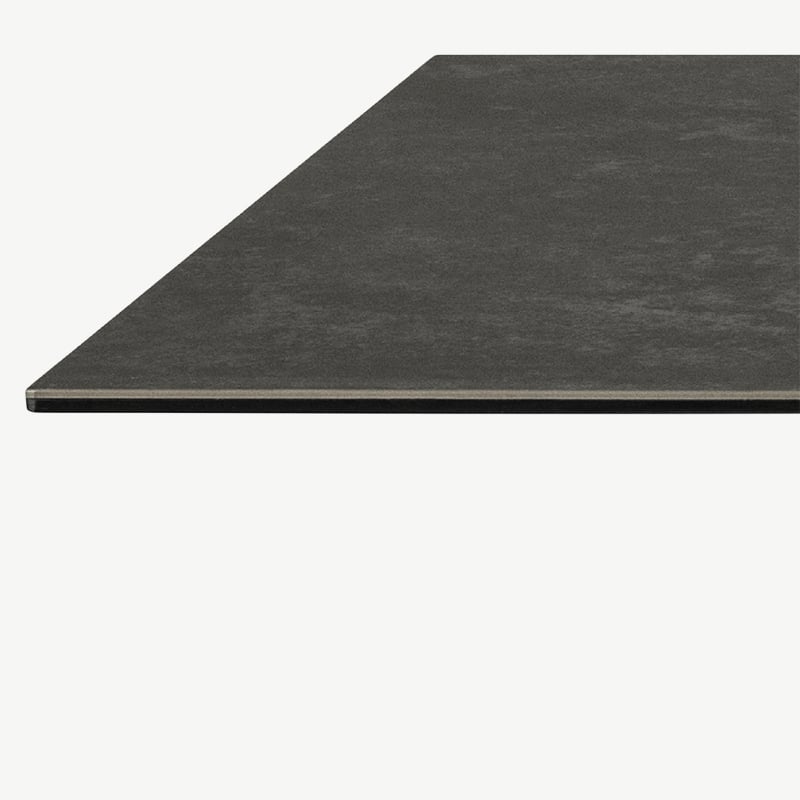 Die Tischplatte aus schwarzer, strukturierter Keramik bietet eine natürliche Steinoptik mit taktiler Oberfläche. Sie ist nicht nur optisch ansprechend, sondern auch hitze- und kratzbeständig – ideal für den täglichen Gebrauch. Das schwarze Metallgestell verleiht dem Tisch Stabilität und einen industriellen Charakter und fügt sich hervorragend in minimalistische, moderne oder urbane Interieurs ein.