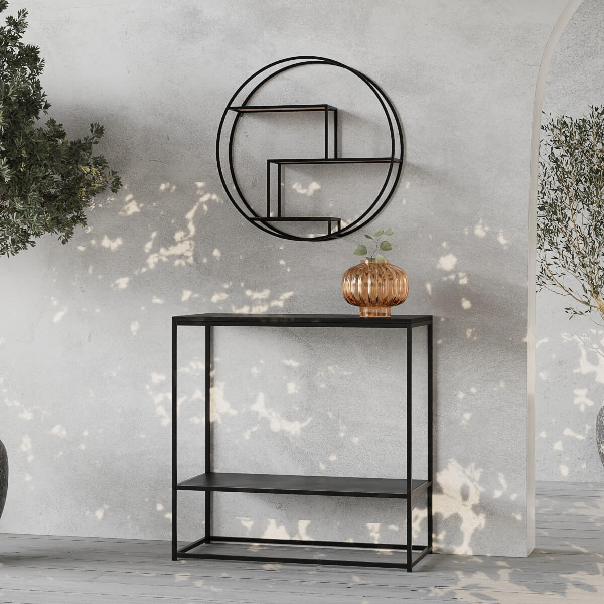 Der Konsolentisch verfügt über zwei großzügige schwarze Holzablagen, die reichlich Platz bieten, um dekorative Vasen, Bücher oder persönliche Schätze zu präsentieren. Sein minimalistisches Layout ermöglicht eine praktische Organisation, während es ein sauberes und aufgeräumtes Erscheinungsbild bewahrt.