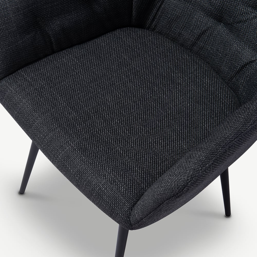 Weicher dunkelgrauer Stoff und eine elegant gesteppte Rückenlehne verleihen diesem Armlehnstuhl eine zeitlose Optik. Der Vinny Esszimmerstuhl verbindet Komfort mit klarer Linienführung: Die gepolsterte Sitzfläche und die Armlehnen machen ihn besonders einladend, während die schwarzen Metallbeine für Stabilität und ein modernes Erscheinungsbild sorgen.