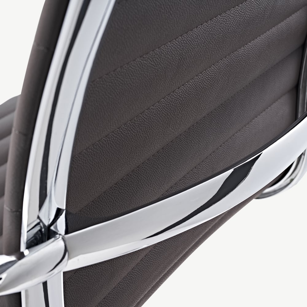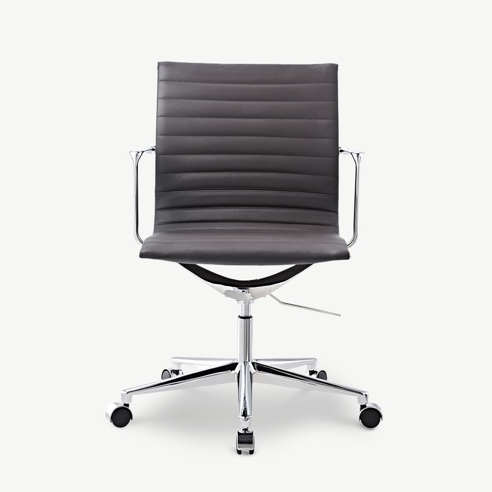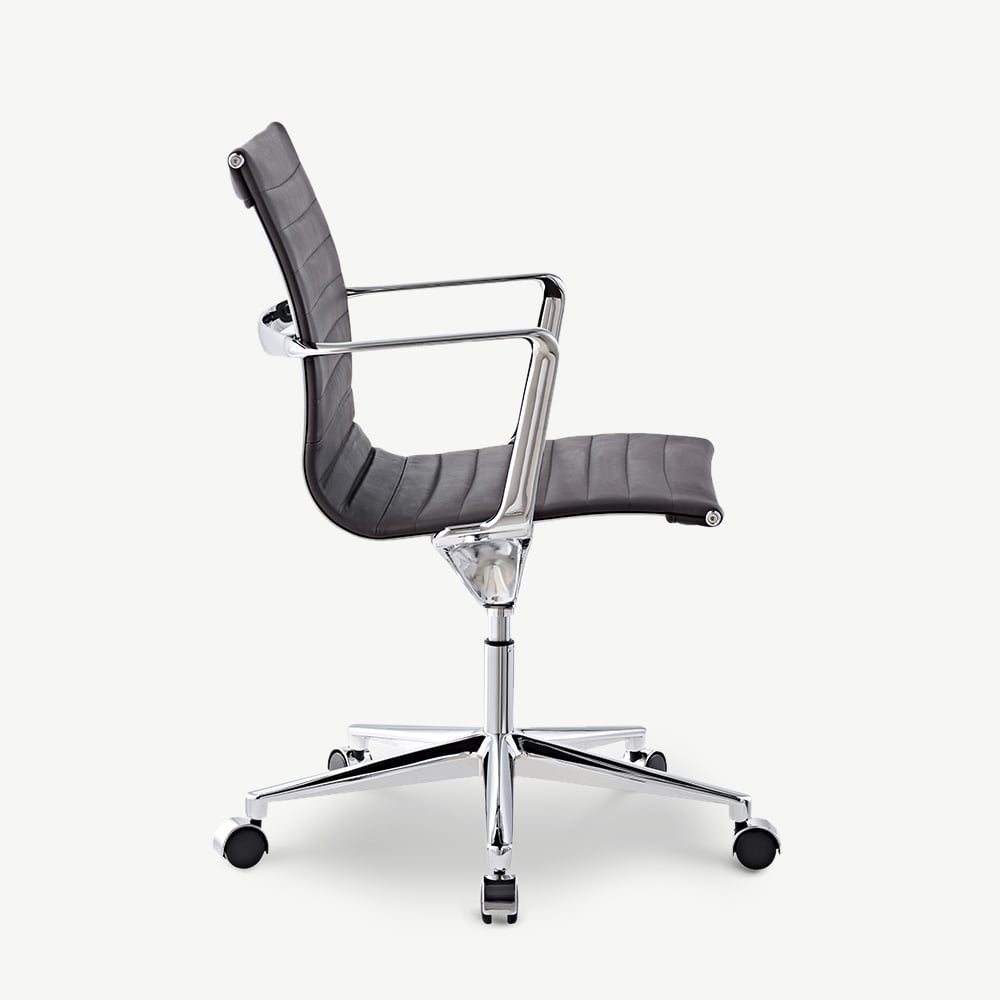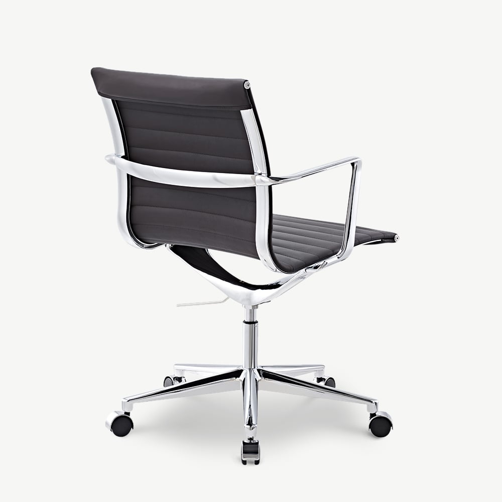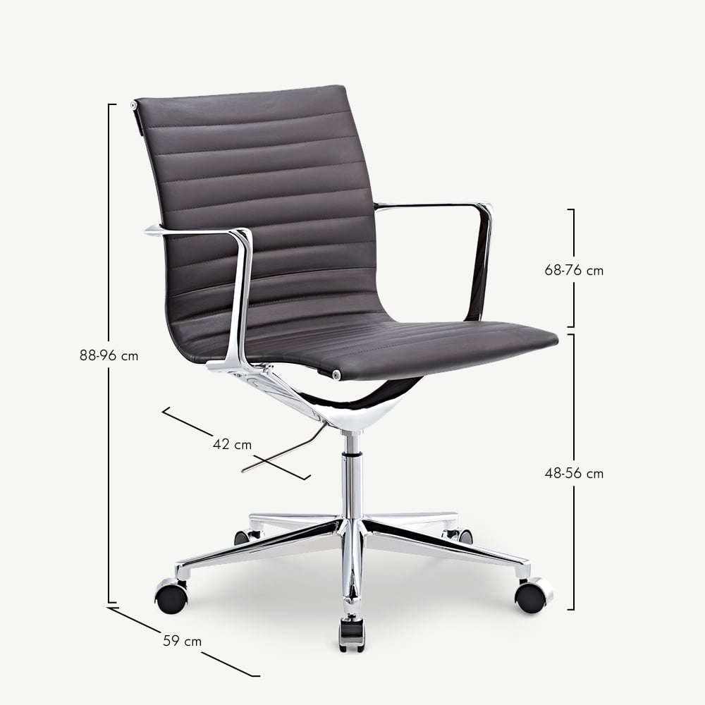 Der Walton Bürostuhl zeichnet sich durch eine Premium-Lederpolsterung, verchromte Beine für einen Hauch von Eleganz und ein geripptes Design im Mid-Century-Stil aus. Dieser Stuhl verbindet Stil und Funktionalität auf ideale Weise.
