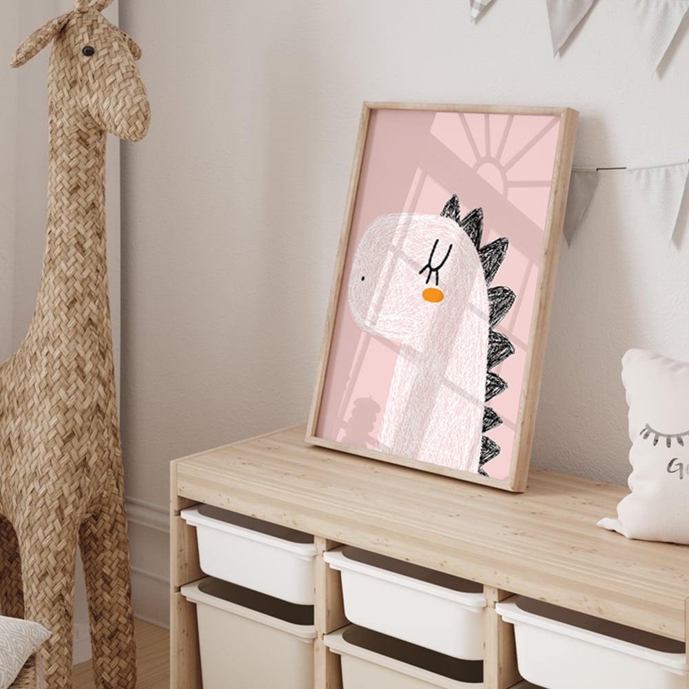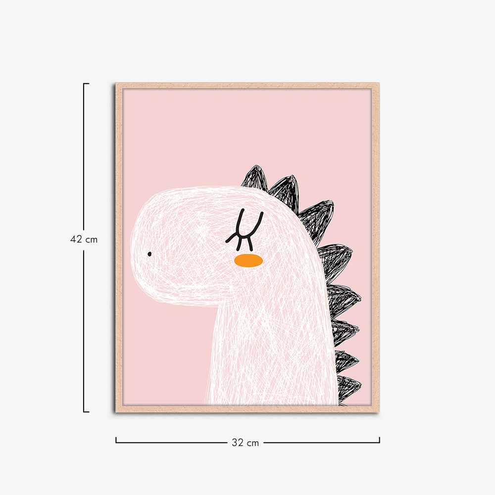 Das Wandbild Comic-Dinosaurier wird in einem naturfarbenen Rahmen geliefert, der für seine Langlebigkeit und natürliche Schönheit bekannt ist. Der Holzrahmen präsentiert das Wandbild auf eine Weise, die ihm Tiefe und Dimension verleiht und es zu einem echten Blickfang in Ihrem Interieur macht.