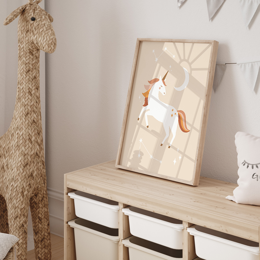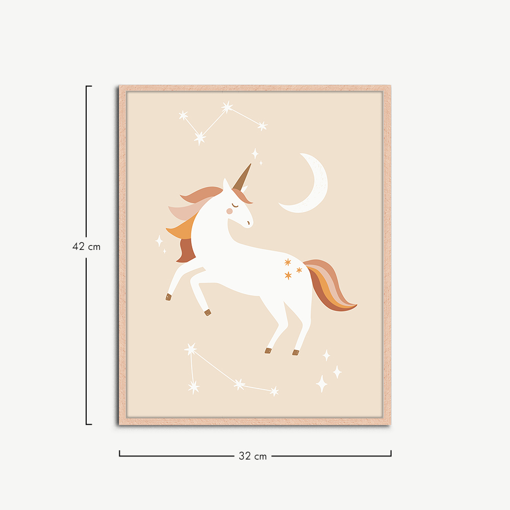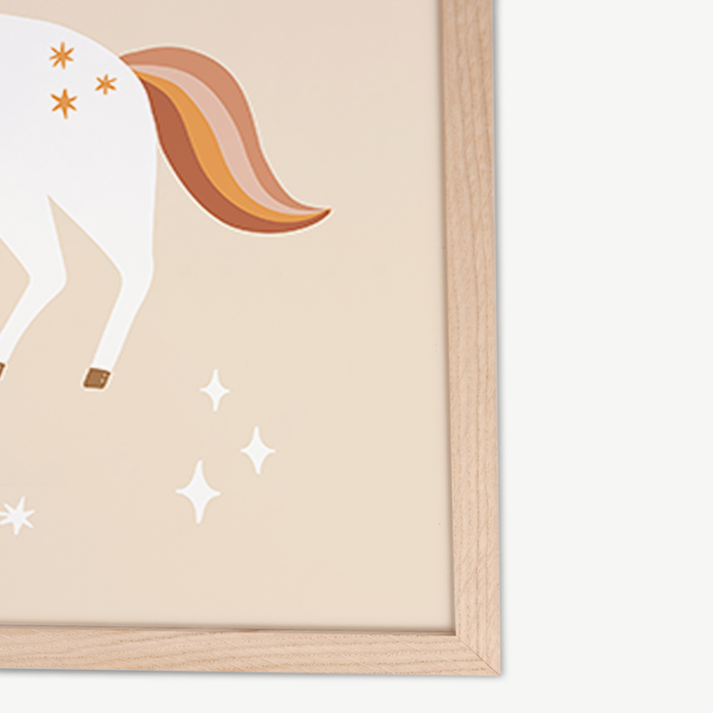 Das Wandbild Ich liebe Einhörner wird in einem naturfarbenen Rahmen geliefert, der für seine Langlebigkeit und natürliche Schönheit bekannt ist. Der Holzrahmen präsentiert das Wandbild auf eine Weise, die ihm Tiefe und Dimension verleiht und es zu einem echten Blickfang in Ihrem Interieur macht.