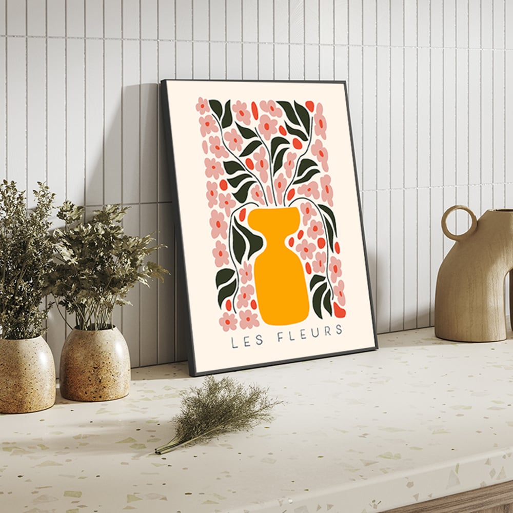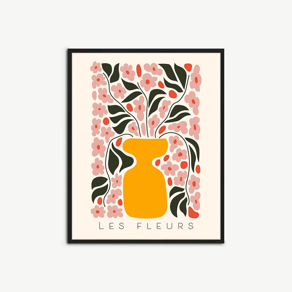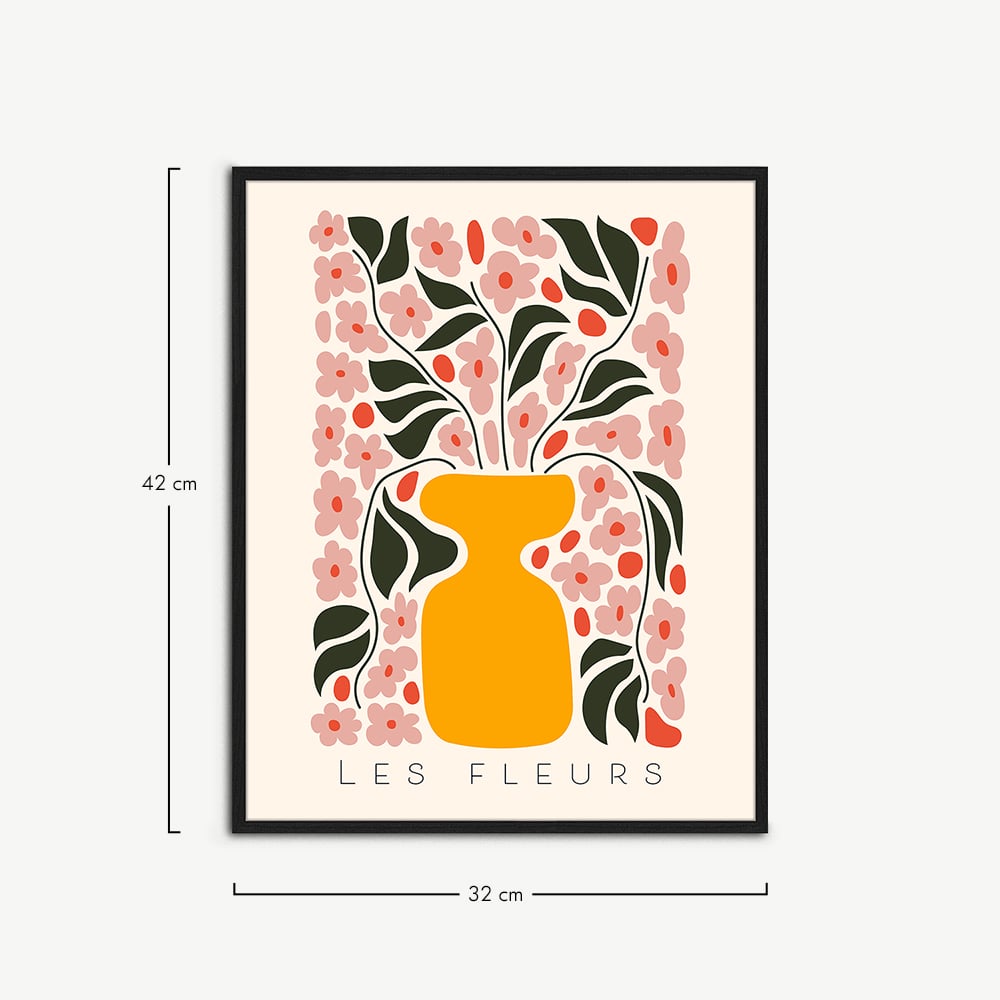 Das Wandbild Les Fleurs wird in einem schwarzen Rahmen geliefert, der für seine Langlebigkeit und natürliche Schönheit bekannt ist. Der Holzrahmen präsentiert das Leinwandbild auf eine Weise, die ihm Tiefe und Dimension verleiht und es so zu einem echten Blickfang in Ihrem Interieur macht.
