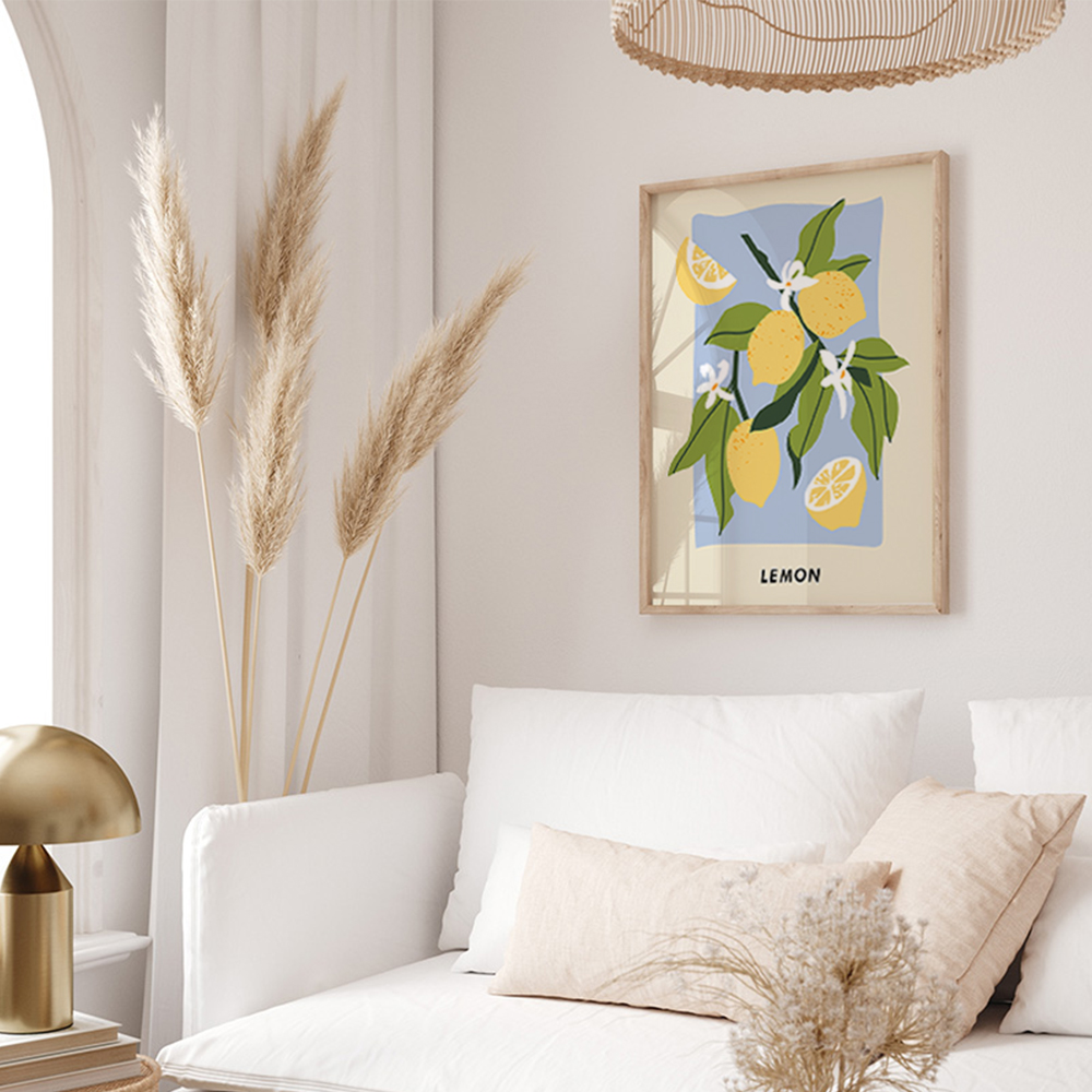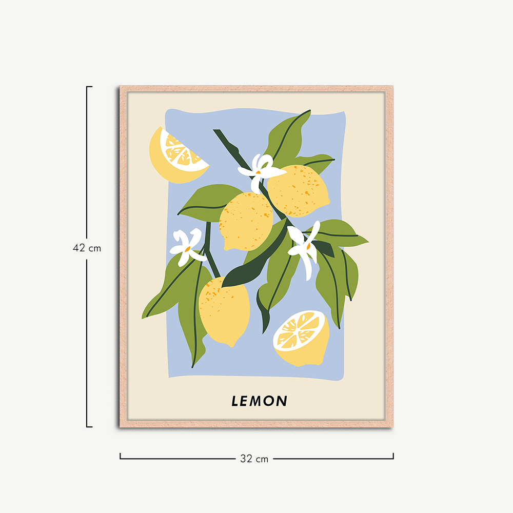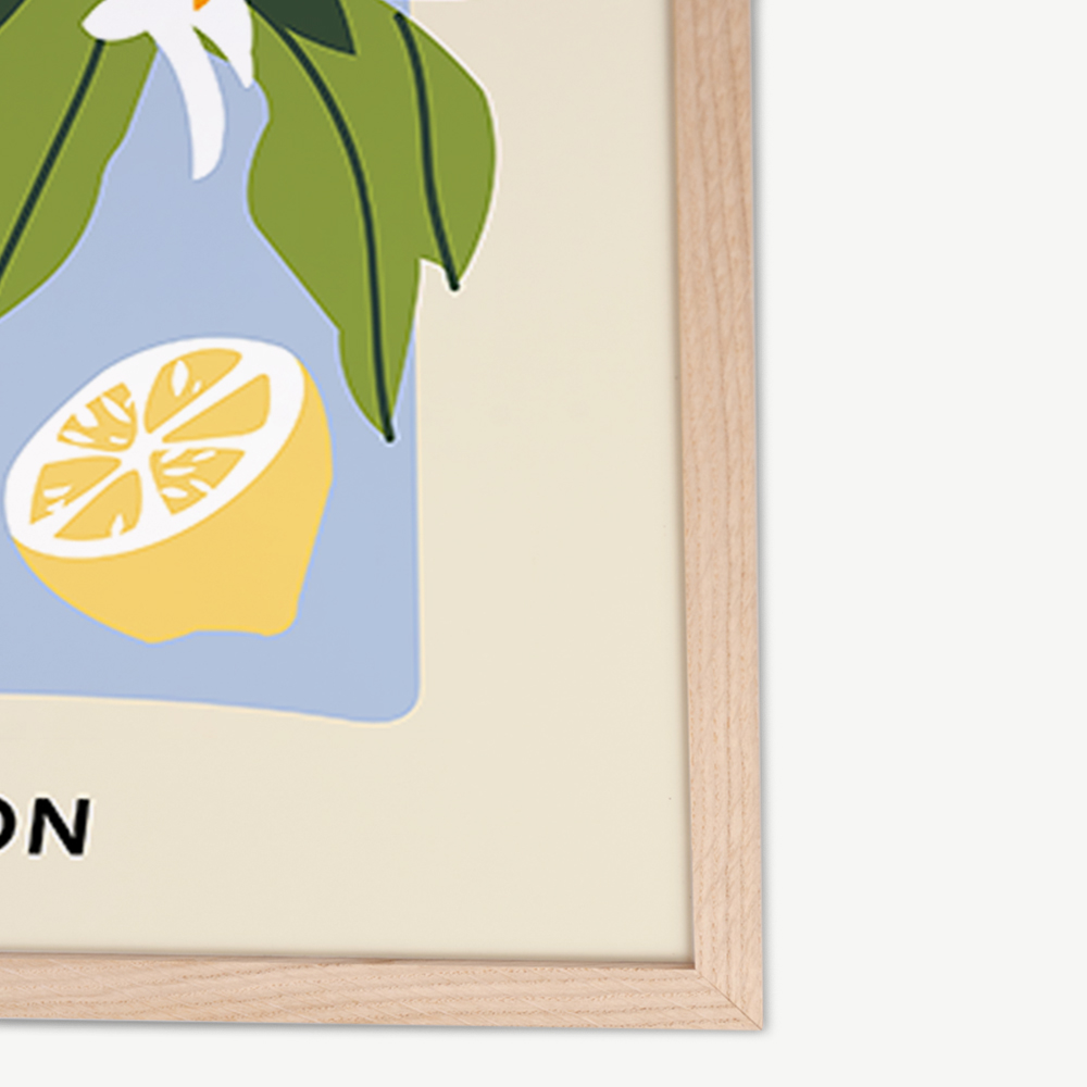 Das Wandbild Zitrone wird in einem naturfarbenen Rahmen geliefert, der für seine Langlebigkeit und natürliche Schönheit bekannt ist. Der Holzrahmen präsentiert das Wohnzimmer-Wandbild auf eine Weise, die ihm Tiefe und Dimension verleiht und es zu einem echten Blickfang in Ihrem Interieur macht.