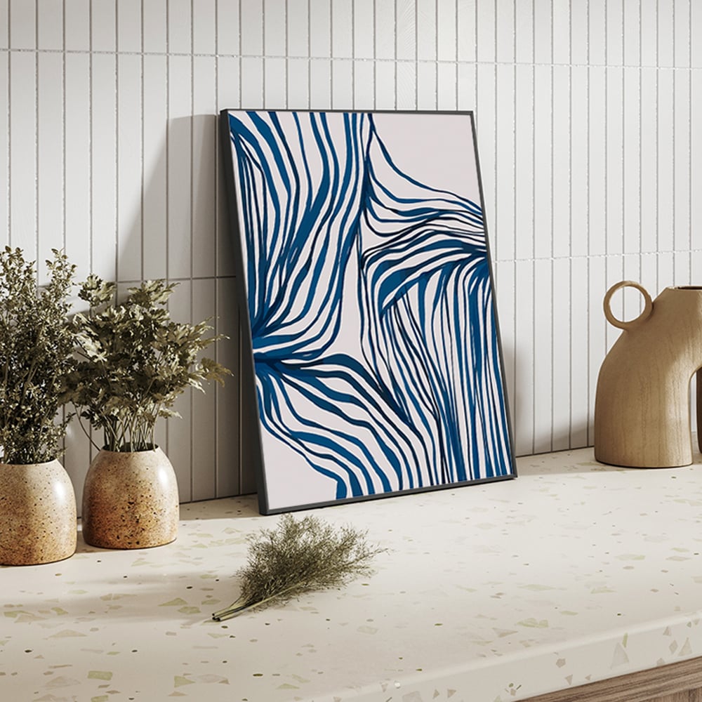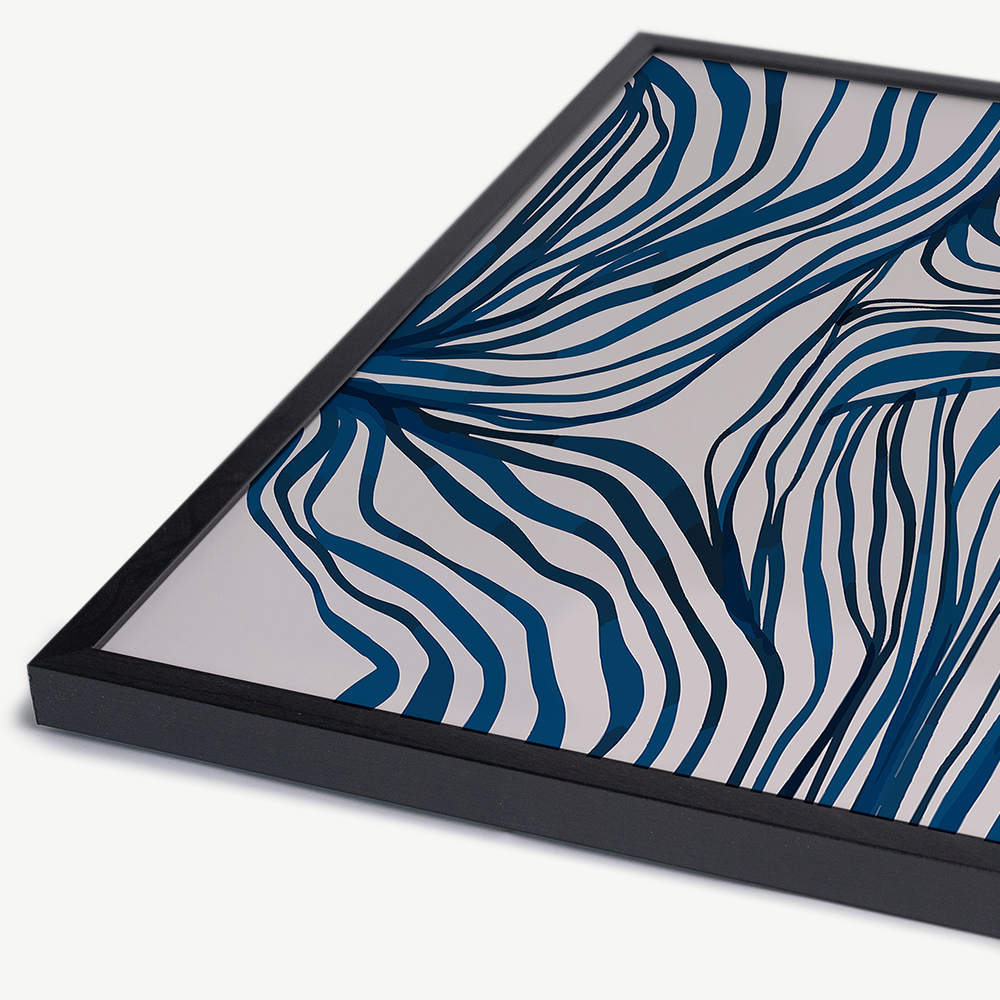 The Abstract Blue Wall Art comes in a black frame, known for its durability and natural beauty. The wooden frame displays the abstract wall art in a way that adds depth and dimension, making it a true focal point in your interior.