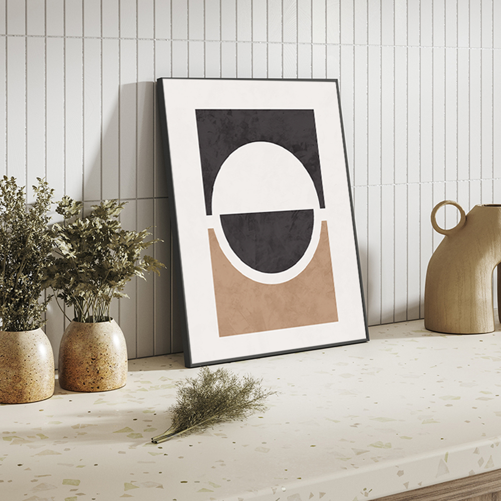 The Abstract Circle Wall Art is a stunning addition to any space. This elegant wall art print is beautifully showcased in a black beechwood thin frame, giving it a refined and sophisticated look.