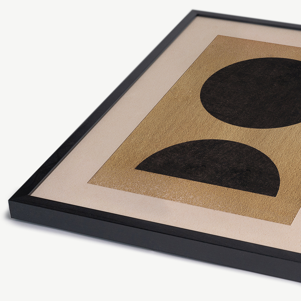 The Abstract Gold Wall Art is encased in a black beechwood frame, renowned for its durability and natural beauty. The wooden frame enhances the depth and dimension of the abstract print, making it a true focal point in any interior.