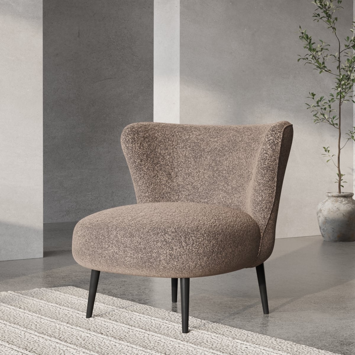 The Ania Lounge Chair combines luxurious comfort with stylish design, making it a perfect choice for cosy corners or reading nooks. Featuring a soft brown bouclé fabric, a gently curved backrest, and sturdy black tapered legs, this chair offers both sophistication and warmth, effortlessly elevating your living space.