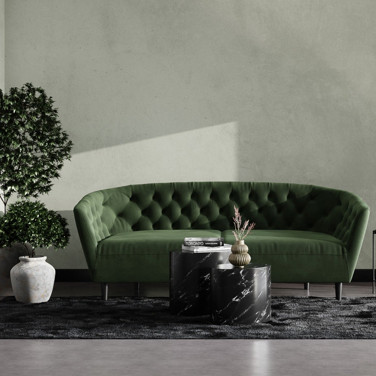 The Aria 3 Seater Sofa in forest green velvet is the epitome of elegance and sophistication. Designed to make a statement, its rich velvet upholstery, deep tufted backrest, and gracefully curved silhouette bring a refined yet inviting charm to any interior. A perfect blend of vintage glamour and modern luxury.