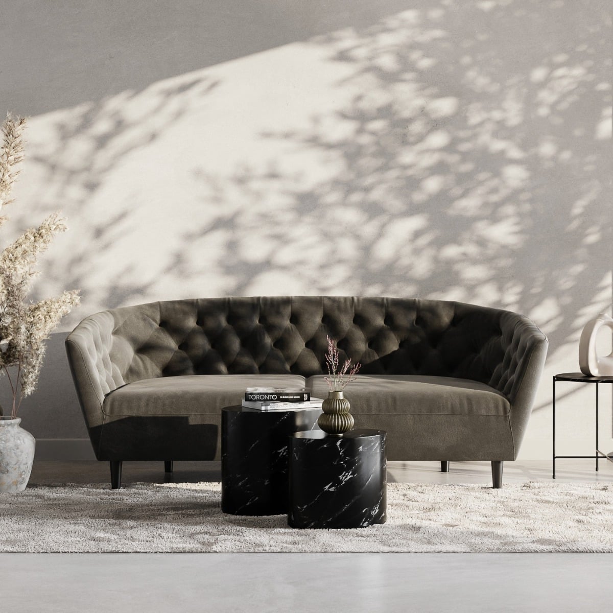 The Aria Sofa’s tufted detailing and sculptural form add a sense of grandeur, while the forest green velvet upholstery infuses richness and warmth. Whether placed in a lavish living room, an elegant office, or a boutique-style lounge, its bold presence transforms any space with timeless sophistication.