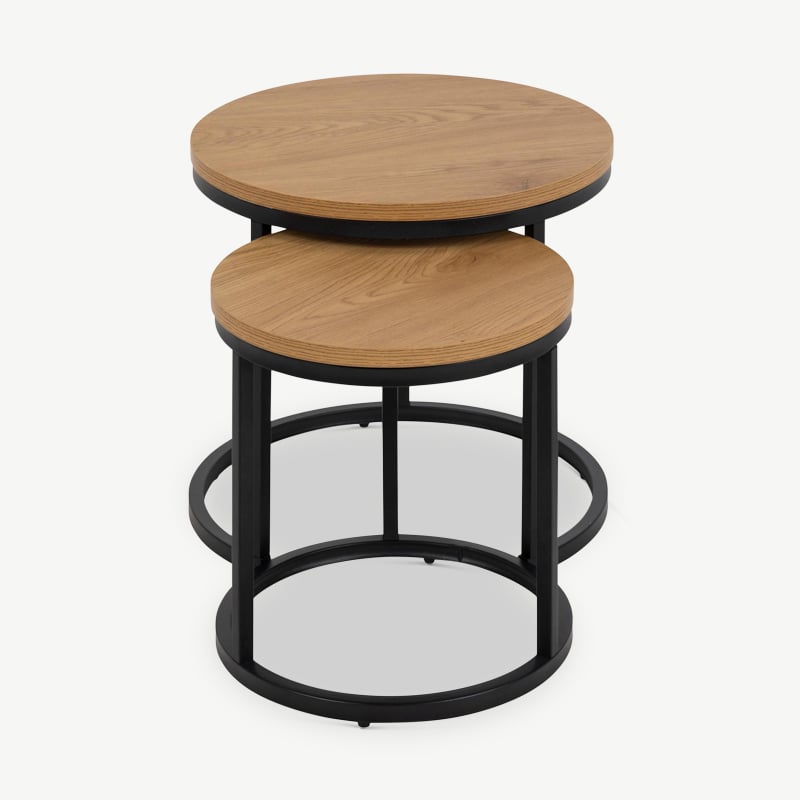 The Aria Nesting Side Tables offer a perfect blend of modern aesthetics and practicality. Featuring a natural wood top and a sleek black metal frame, this set of two tables provides a stylish and space-saving solution for contemporary interiors. Their clean lines and minimalist structure make them a versatile addition to any living space.