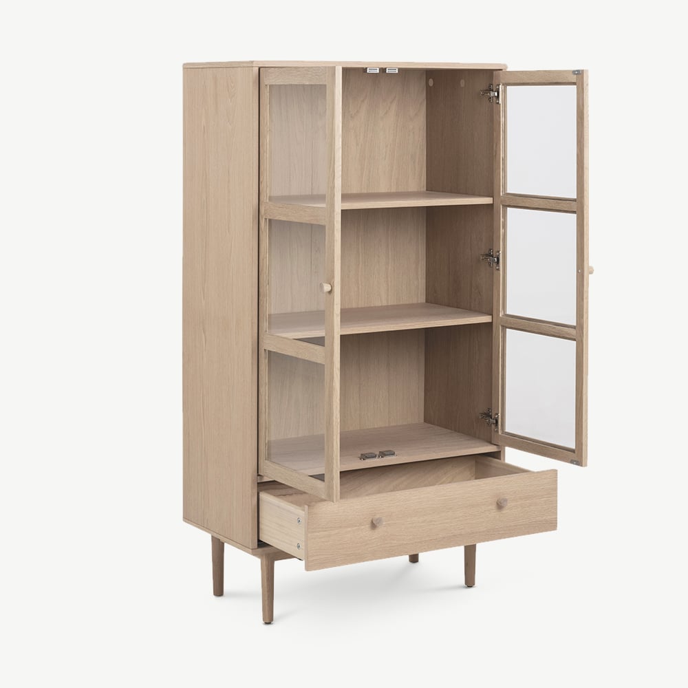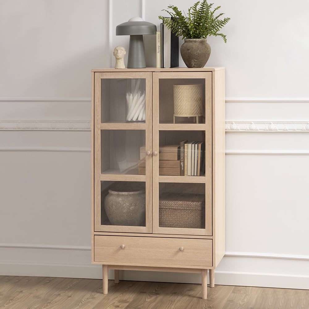 Clean lines, slim legs and minimal handles give the Armando Display Cabinet a timeless look that adds subtle structure to your space. The clear doors and natural oak finish bring a soft, contemporary vibe, helping you create a calming environment without compromising on style or storage.