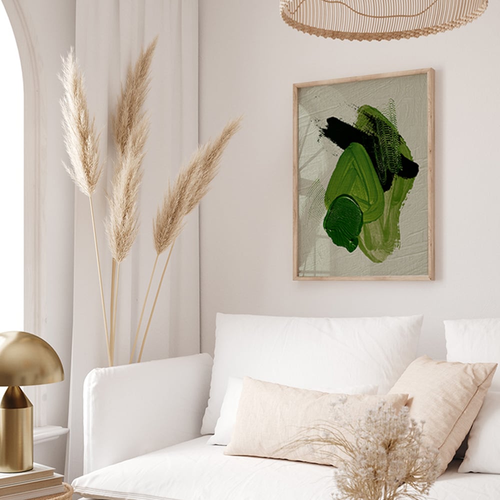 The Artistic Green Abstract Wall Art is encased in a natural beechwood frame, renowned for its durability and natural beauty. The wooden frame enhances the depth and dimension of the abstract print, making it a true focal point in any interior.