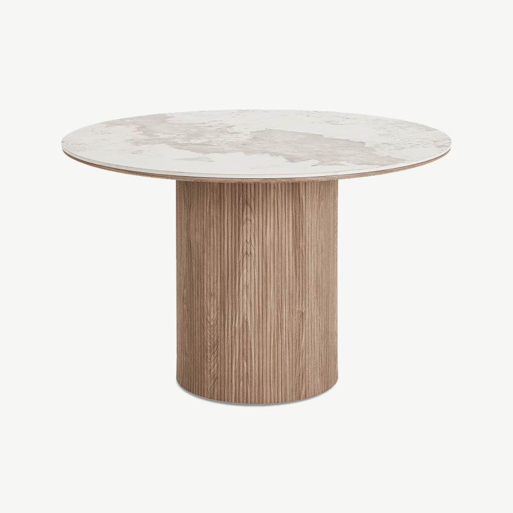Cool white ceramic meets warm wood tones in the Athena Dining Table, a contemporary centrepiece designed for connection and comfort. Its smooth, durable surface and round silhouette create a welcoming atmosphere, while the rich dark brown base adds contrast and definition.