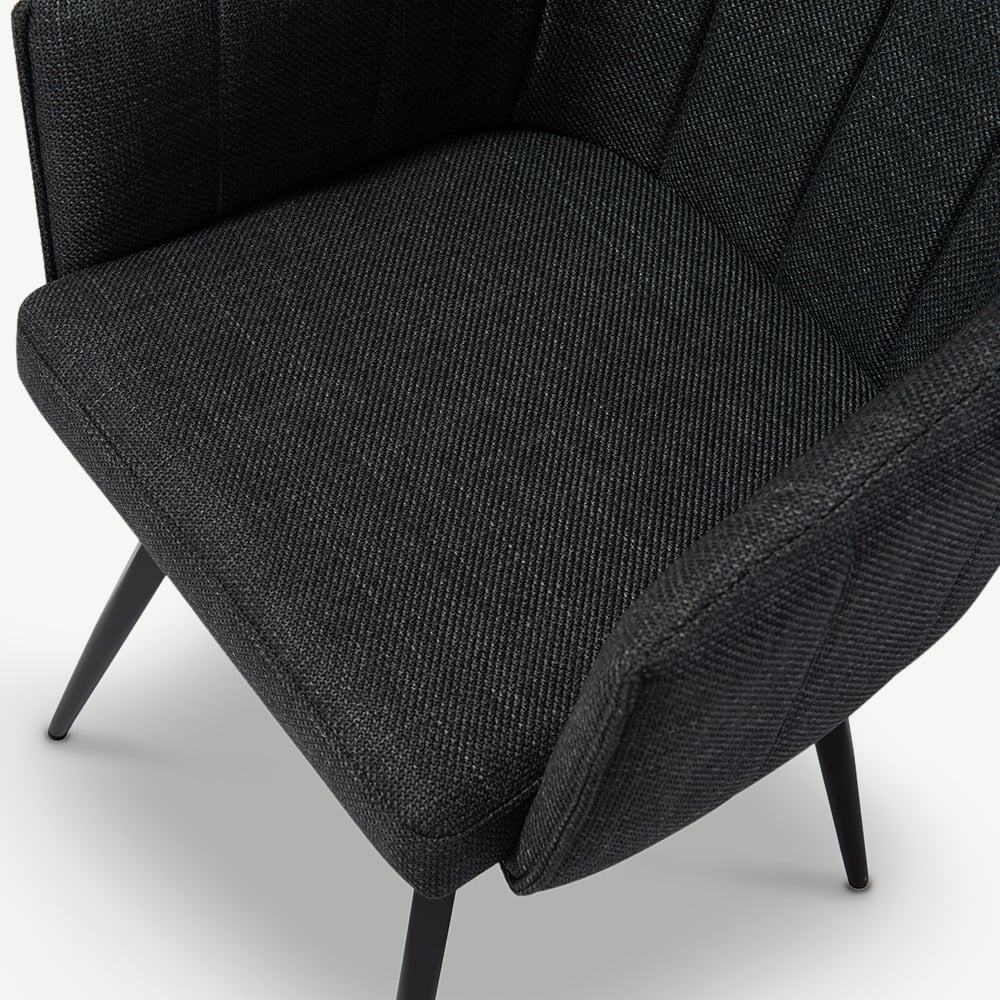 Featuring premium dark grey fabric upholstery with a ribbed design, the Ben chair complements various interior styles. Its neutral yet bold tone pairs seamlessly with wood, glass, or metal dining tables, making it a versatile addition to modern, minimalist, or industrial interiors.