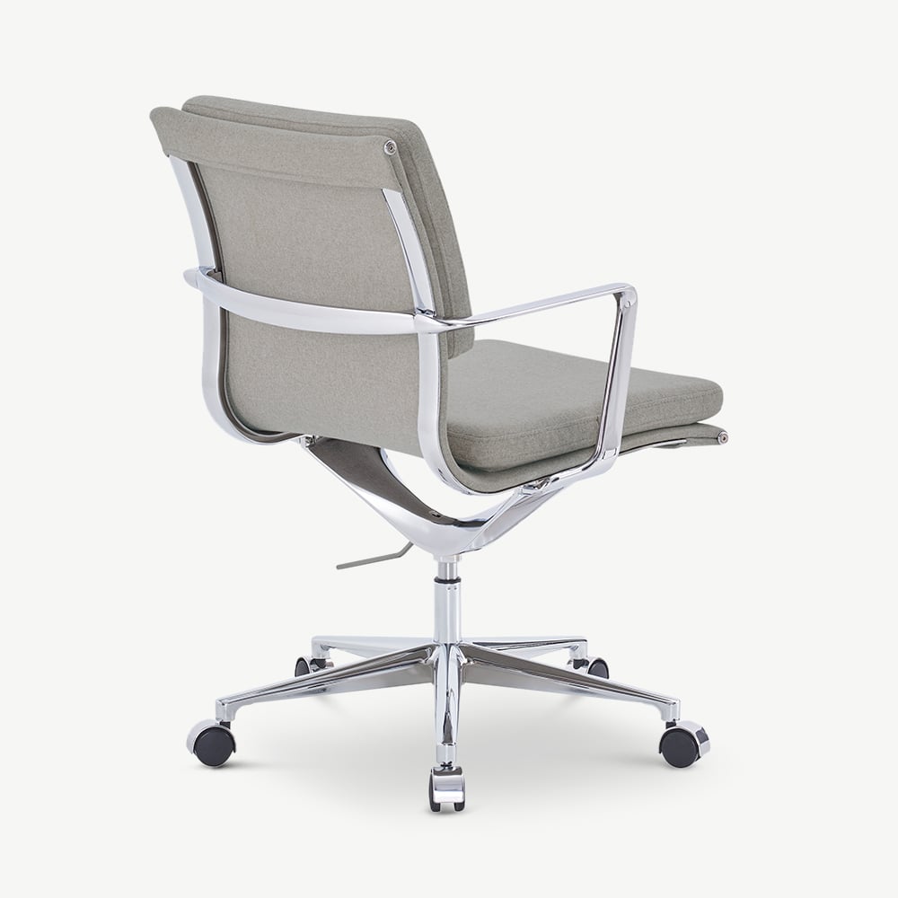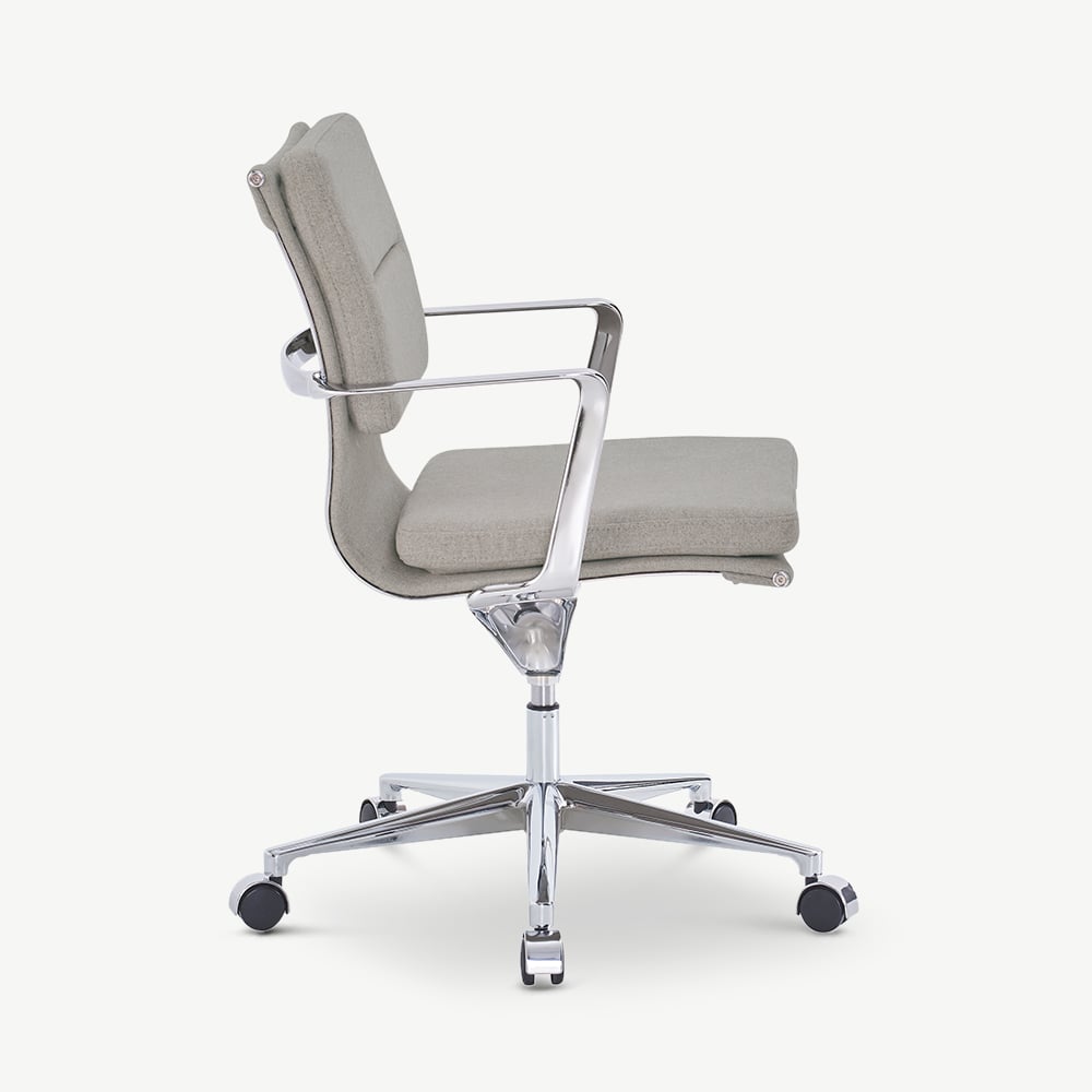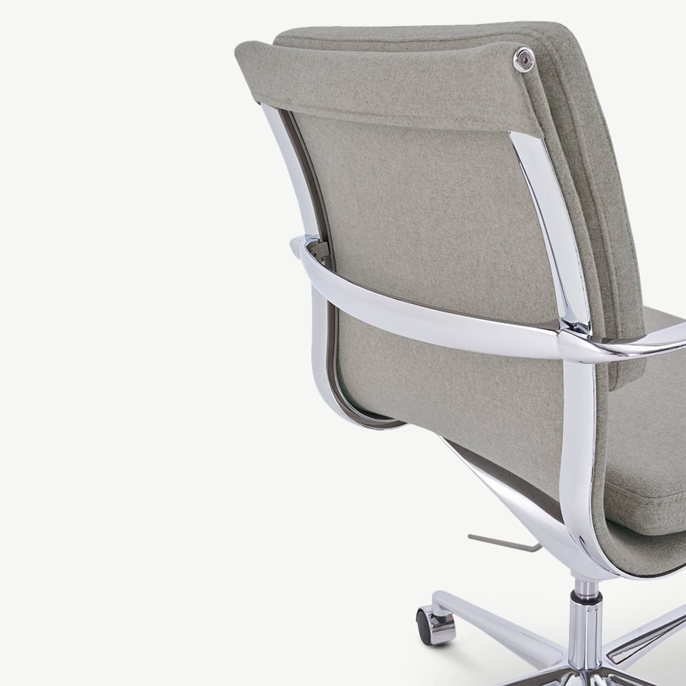 The neutral beige fabric creates a warm, soft foundation, while the chrome frame adds a polished edge that leans into both mid-century and contemporary influences. Compact and calm in form, the Bern chair complements Scandinavian, minimalist, and modern interiors with ease. Pair it with natural wood desks for a balanced look or with monochrome finishes for a sharper, more professional style.