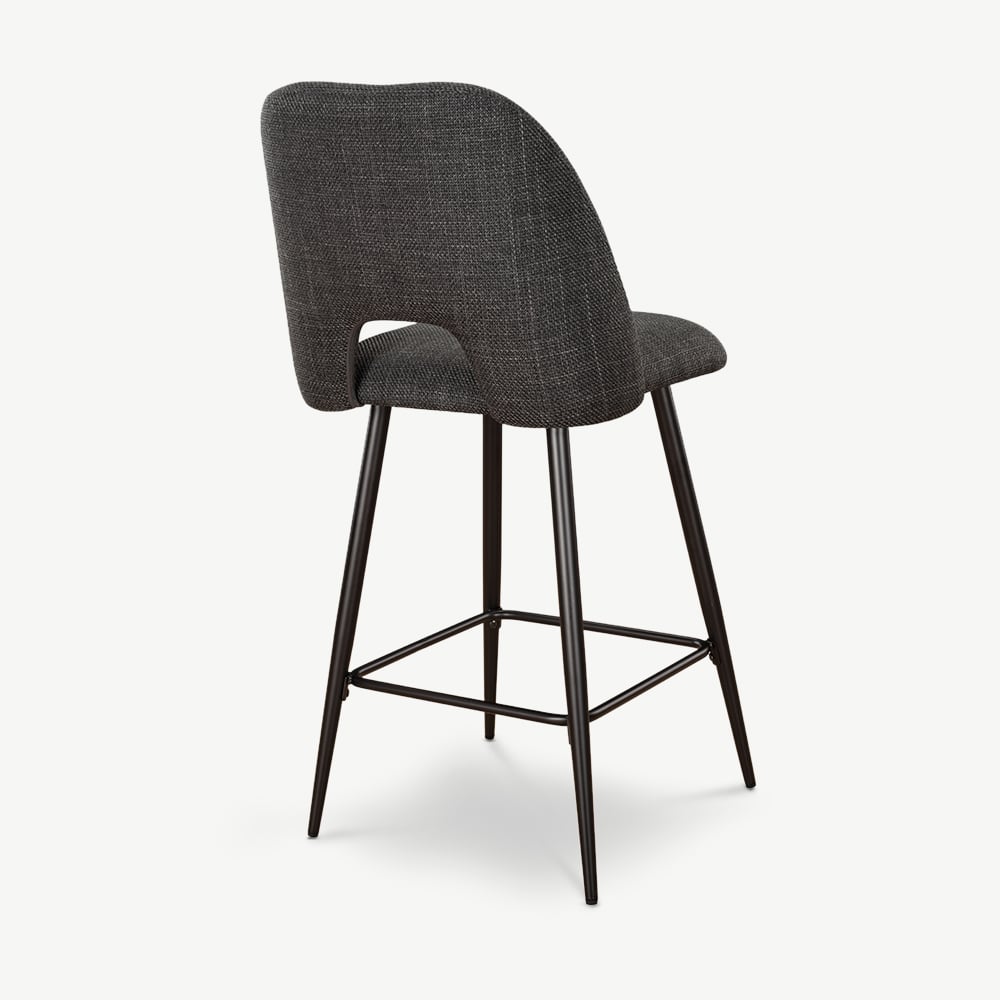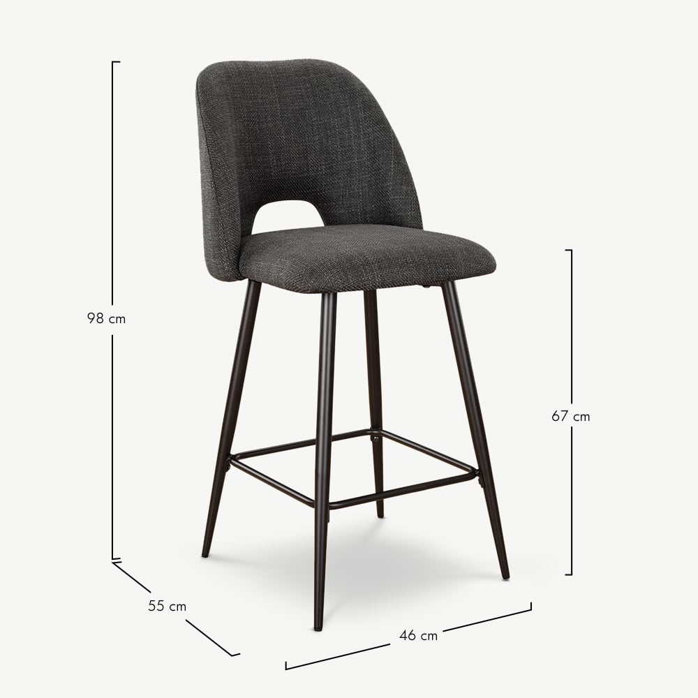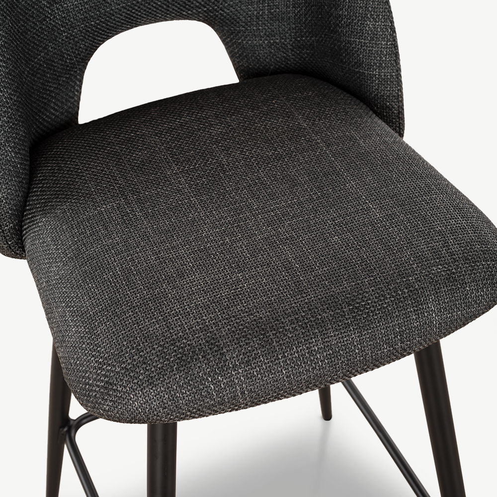The Caio Kitchen Stool in Dark Grey Fabric blends sleek design with everyday comfort. With its sculpted seat, modern cut-out back, and slim black metal legs with an integrated footrest, it’s a refined addition to any kitchen counter or breakfast bar.