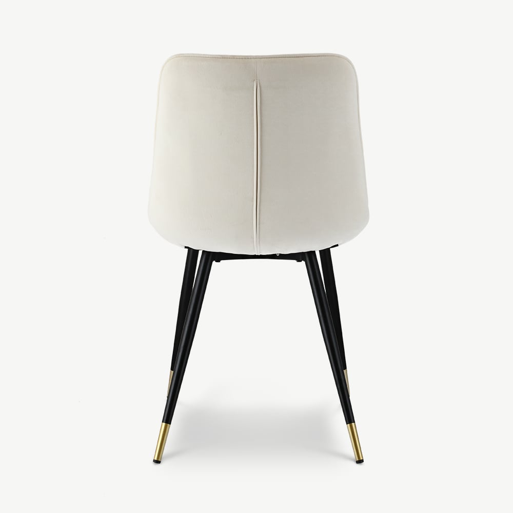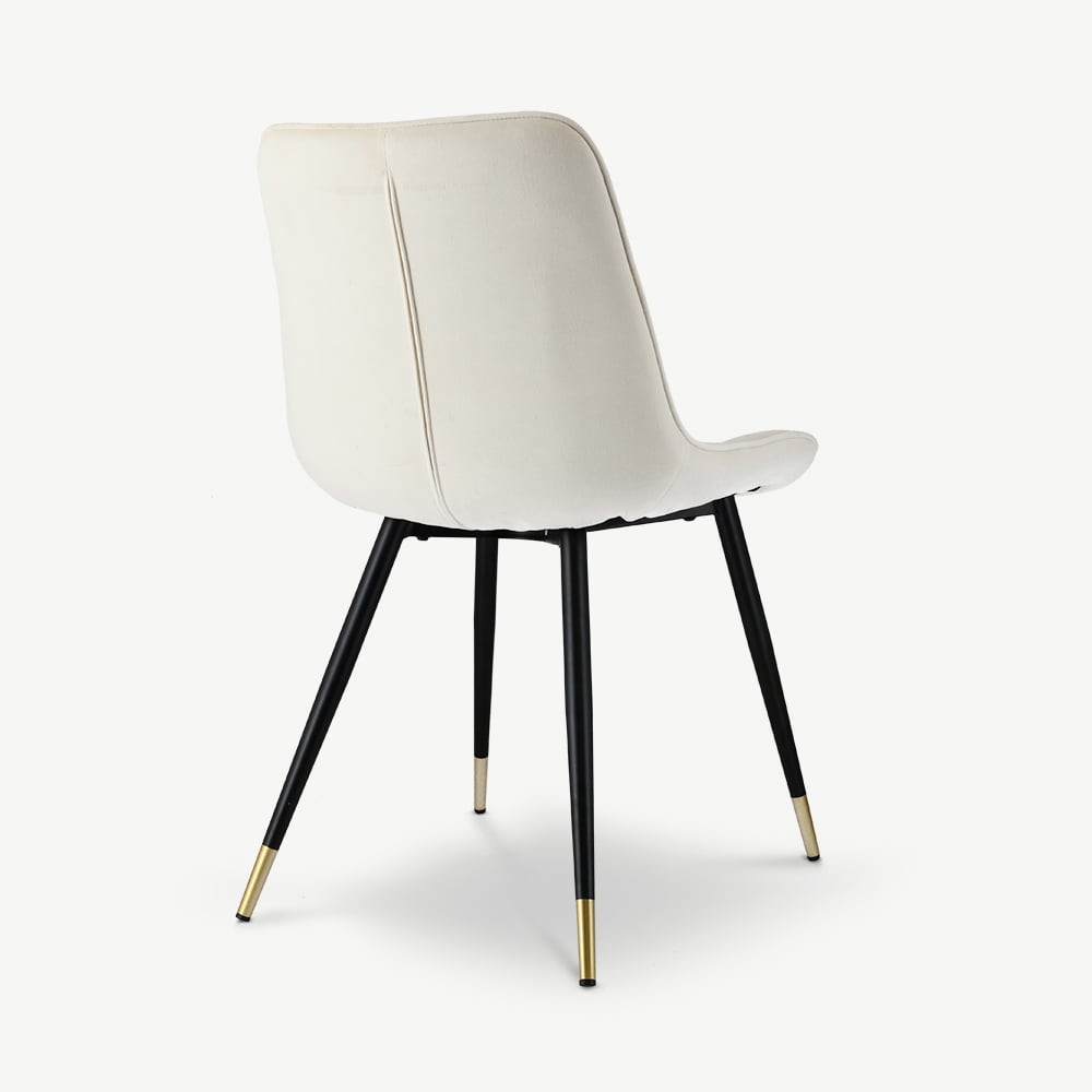 Upholstered in crisp white velvet, this chair feels light and luxurious. It blends beautifully with light wood, glass, or marble dining tables and suits minimalist, Scandinavian or monochrome spaces. The gold-tipped legs add a sophisticated contrast that pairs well with metallic accents or soft neutral tones.