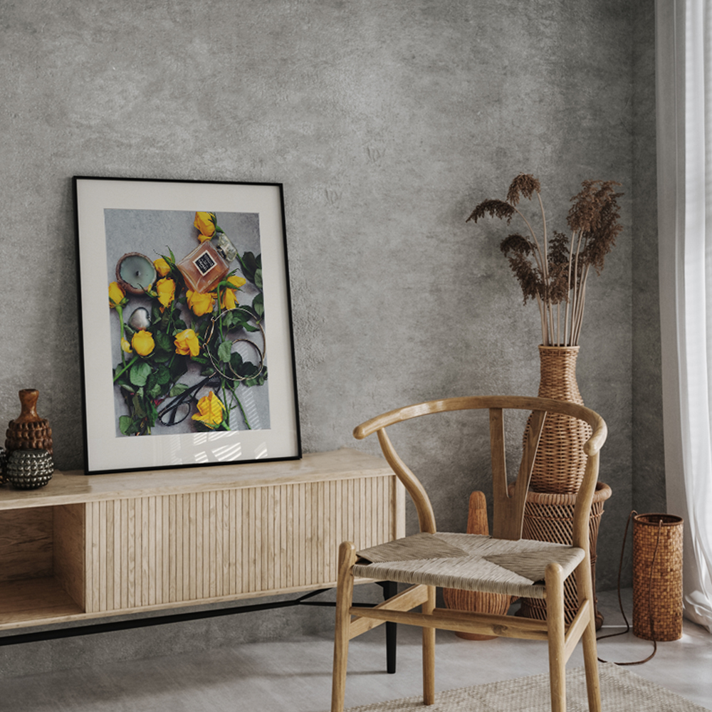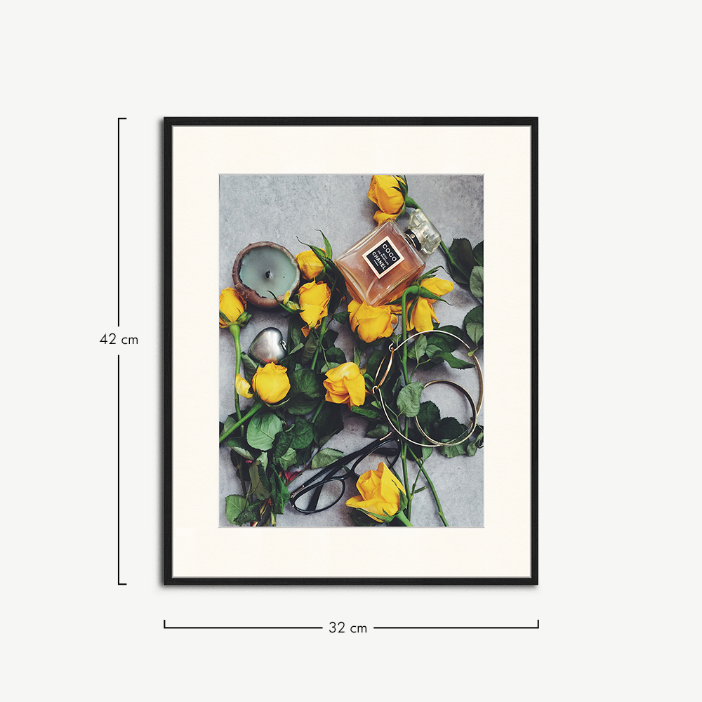 The Coco & Flowers Wall Art features a black beechwood frame, known for its durability and natural beauty. This wooden frame enhances the artwork by adding depth and dimension, making it a true focal point in your interior space.