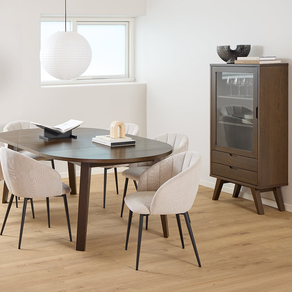 With its tapered legs, slim silhouette and minimalistic finish, the Copenhagen Display Cabinet adds depth and texture without overwhelming your space. It blends seamlessly into dining rooms, living spaces or offices, creating a refined focal point while keeping your belongings organised and beautifully presented.