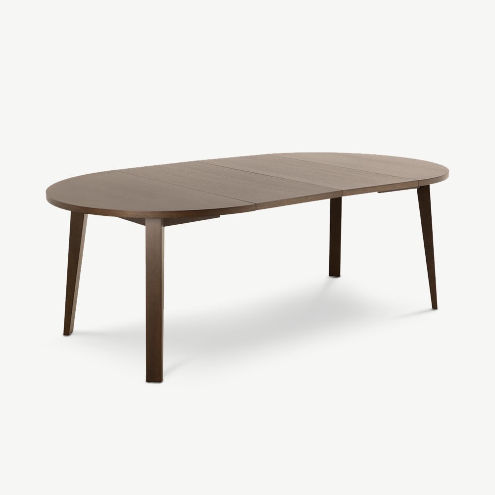 The Copenhagen Extendable Round Dining Table in smoked oak adds a modern edge to timeless Scandinavian design. Made with a smoked oak veneer tabletop and solid oak legs, it seats up to 4 people when closed and extends to 220 cm to seat 6 thanks to the included extension leaves. It's the ideal centrepiece for stylish and versatile dining spaces.