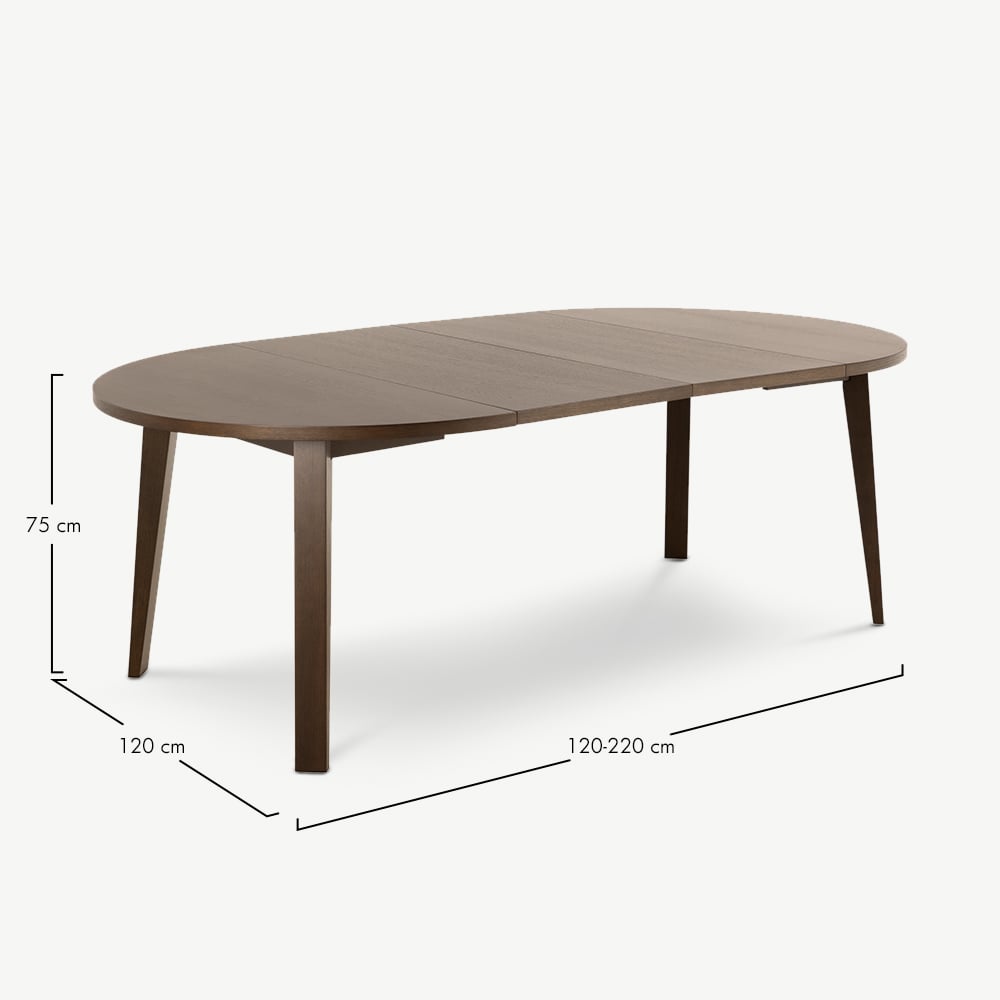 - Seats 4 at Ø120 cm, extends to 220 cm for up to 6