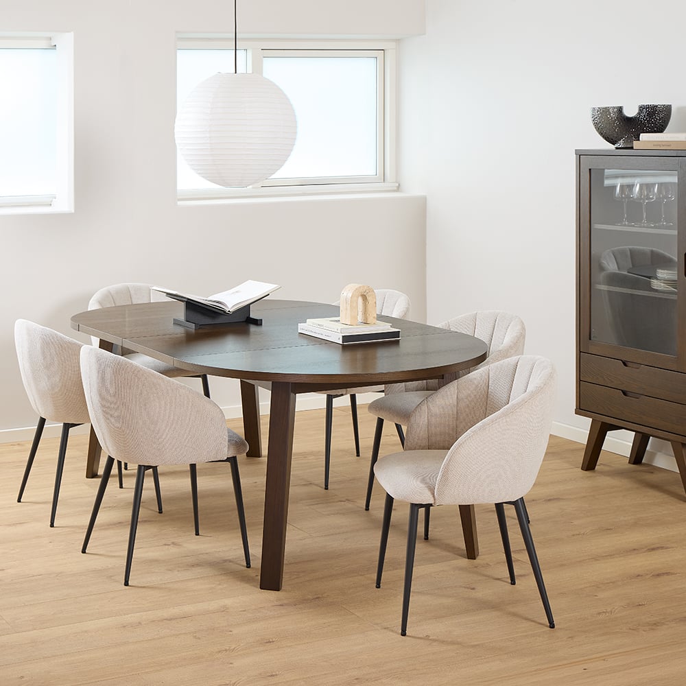 Designed with everyday living in mind, the Ø120 cm table is perfect for intimate meals, and effortlessly extends to 220 cm when guests arrive. The included extension leaves offer instant adaptability for larger gatherings. Its durable veneer surface is easy to maintain, while the solid oak base delivers stability and long-lasting use.