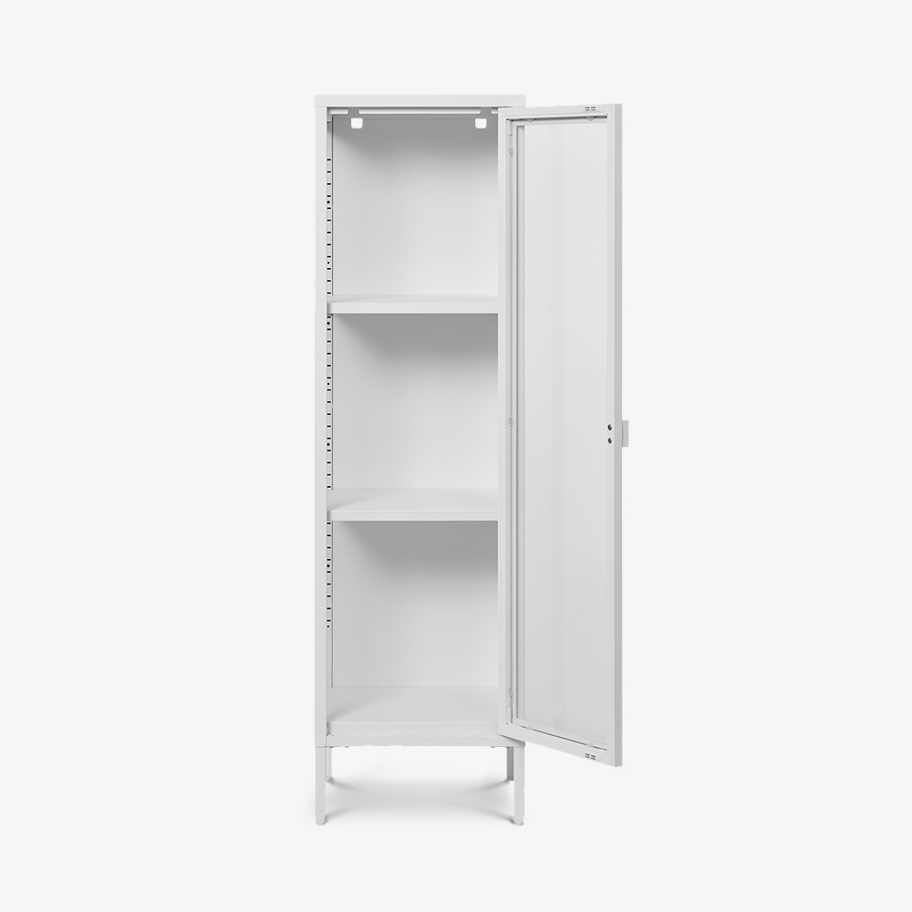 With its clean lines, white metal frame, and glass-panelled door, the Darwin Small Display Cabinet creates a bright and sophisticated look in any room. The minimalist design complements contemporary interiors, while its practical features make it an excellent choice for organising and enhancing your living space.