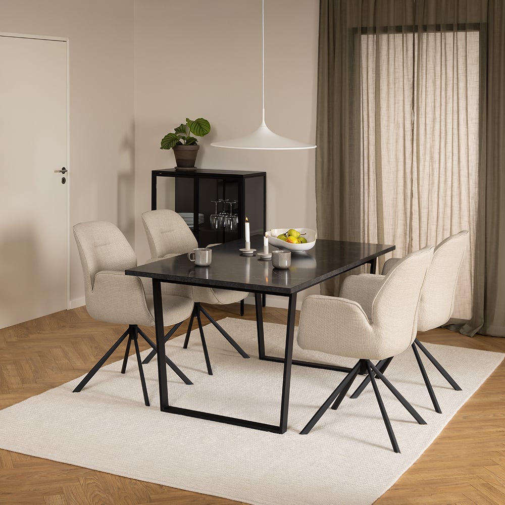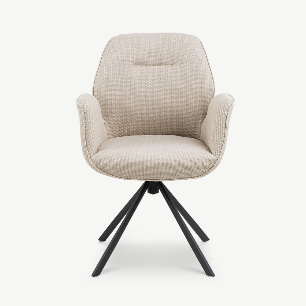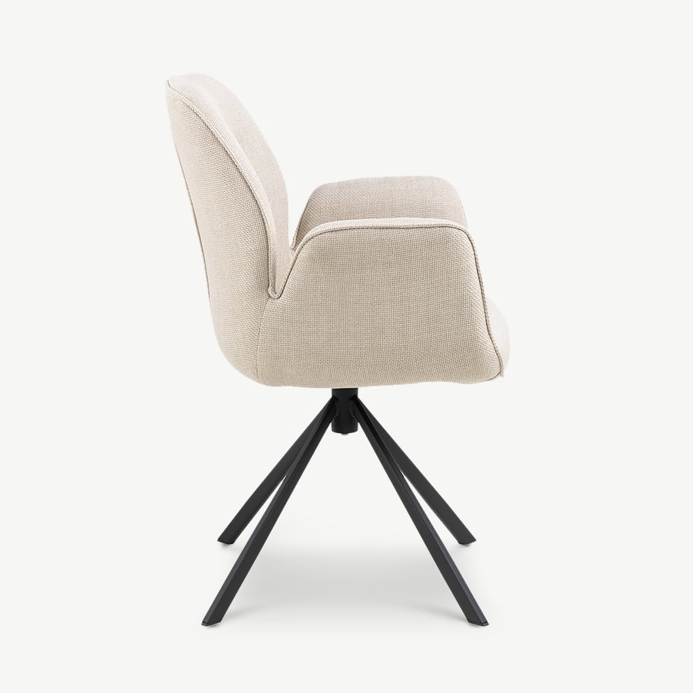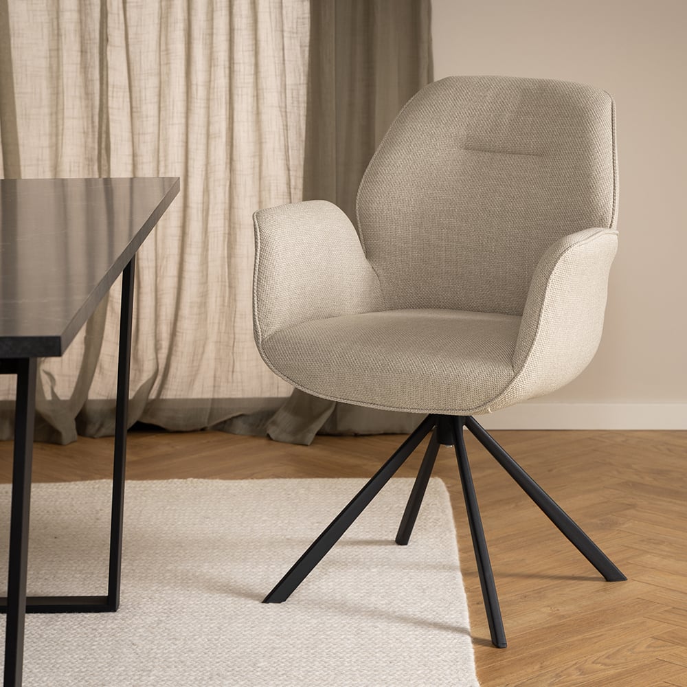 The Davi Swivel Dining Chair blends soft comfort with contemporary design. Upholstered in neutral beige fabric and supported by black powder-coated metal legs, this chair features a smooth swivel function and gently curved armrests, ideal for modern dining spaces, home offices, or multifunctional interiors.